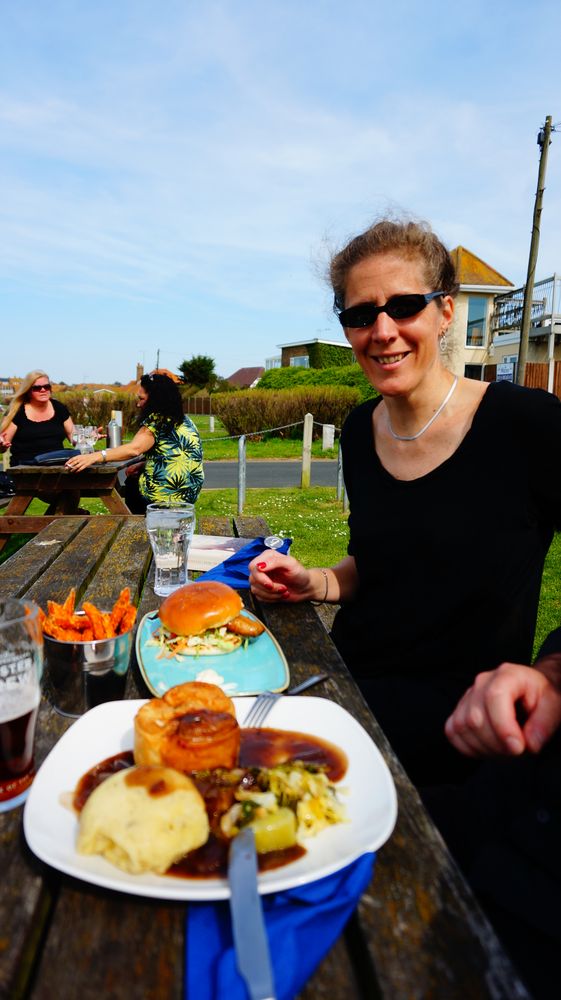 On fait le trajet en sens inverse et on mange à Birchington… mais pas la même chose que la dernière fois: soyons fous! Le petit pot bleu avec du vert dedans, c’est de la purée de petits pois 😉