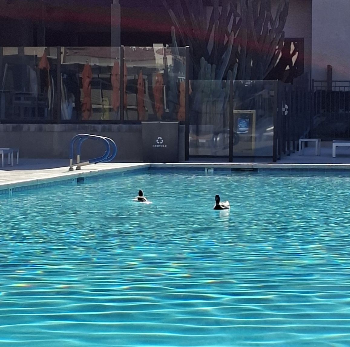 AprĂšs le petit-dĂ©jeuner, on passe par la piscine, prendre la tempĂ©rature ambiante : elle sera parfaite pour un peu de lecture, de Duolingo et de rĂ©daction de blog. Les canards profitent plus que nous de l’eau fraĂźche de la piscine…