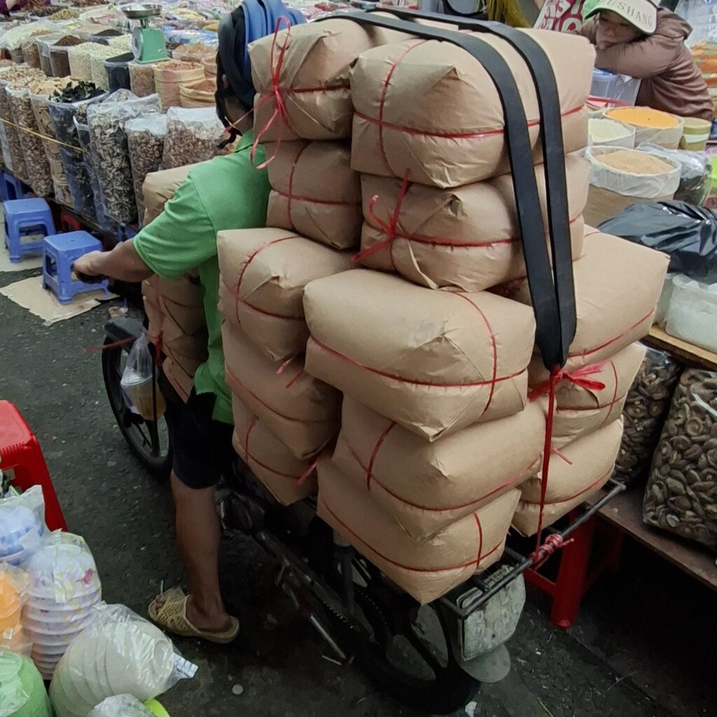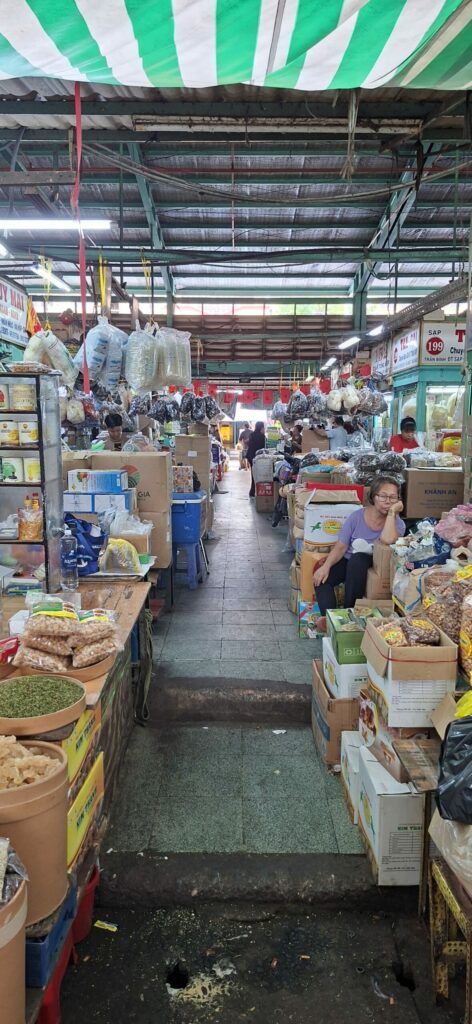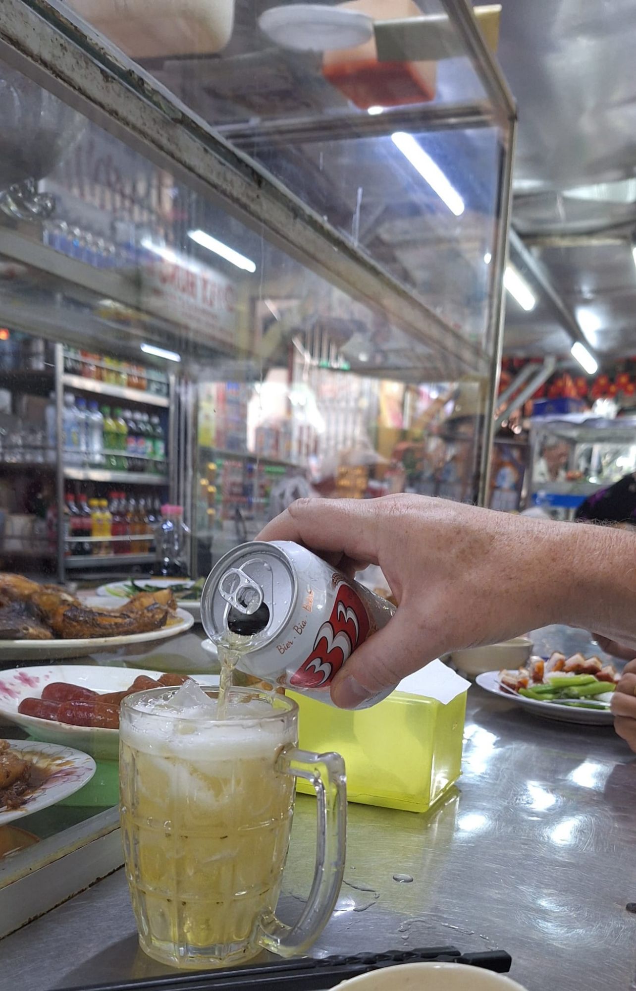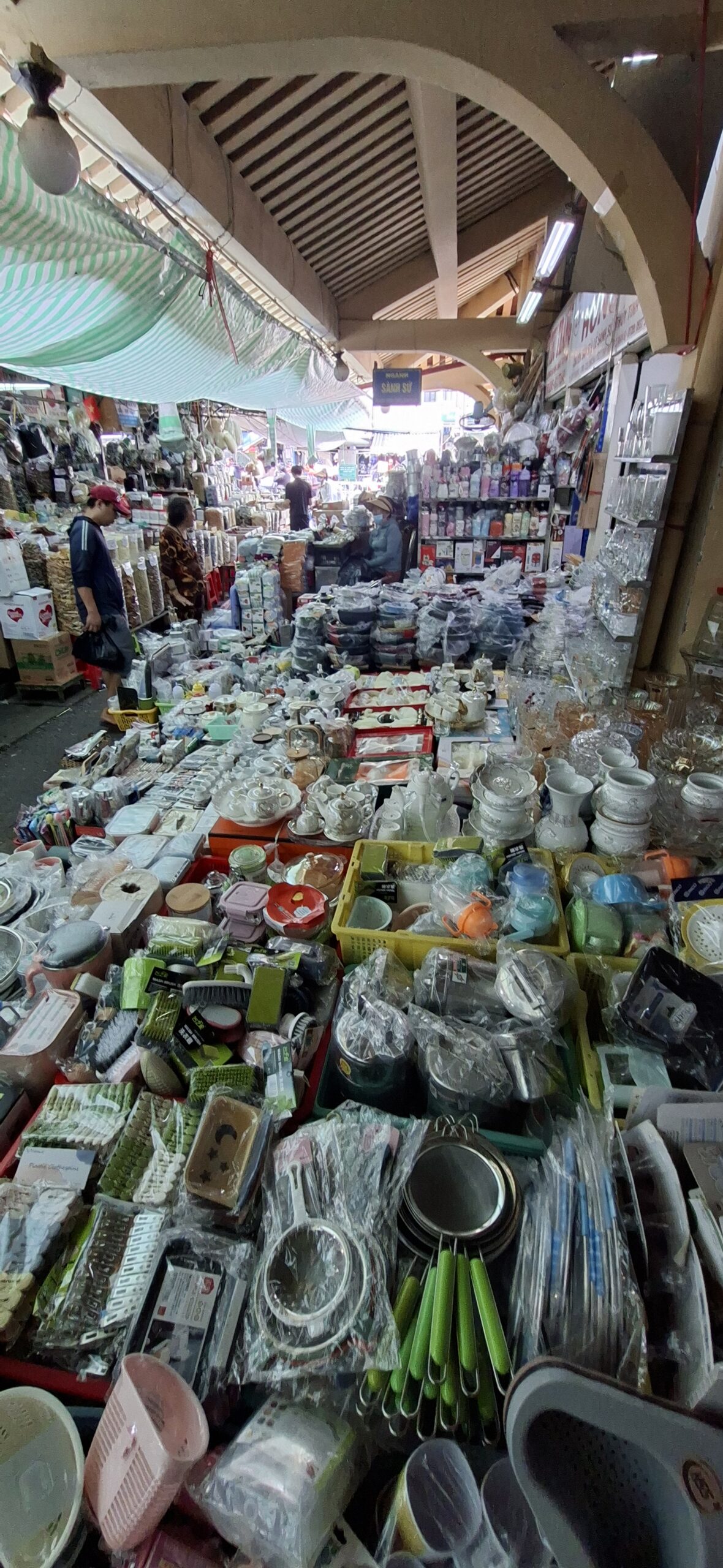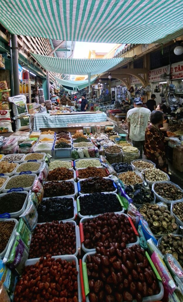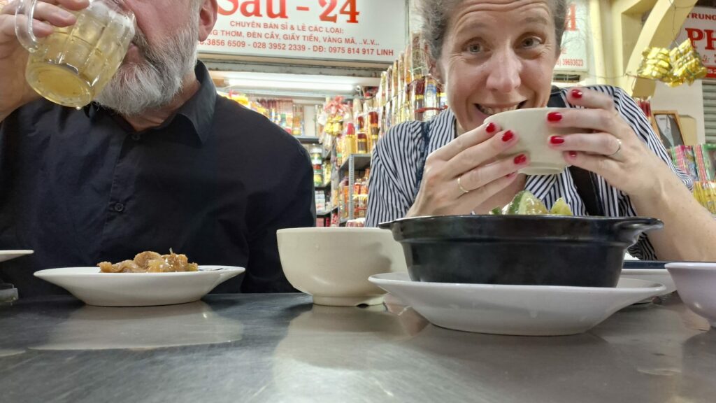 On continue notre périple par la visite (et un repas) au Binh Tay Market, dans le quartier chinois de Cholon. Le repas nous a tout de suite coûté 6€… pour trois 🤯 Benoit a bu sa 333 à la japonaise, c’est-à-dire dans un verre rempli de glaçons (à l’eau minérale, enfin… on espère !) Sinon, on y trouve de tout, mais surtout n’importe quoi. Reno, Marie a acheté des kits (bouillon et épices) pour faire du pho.