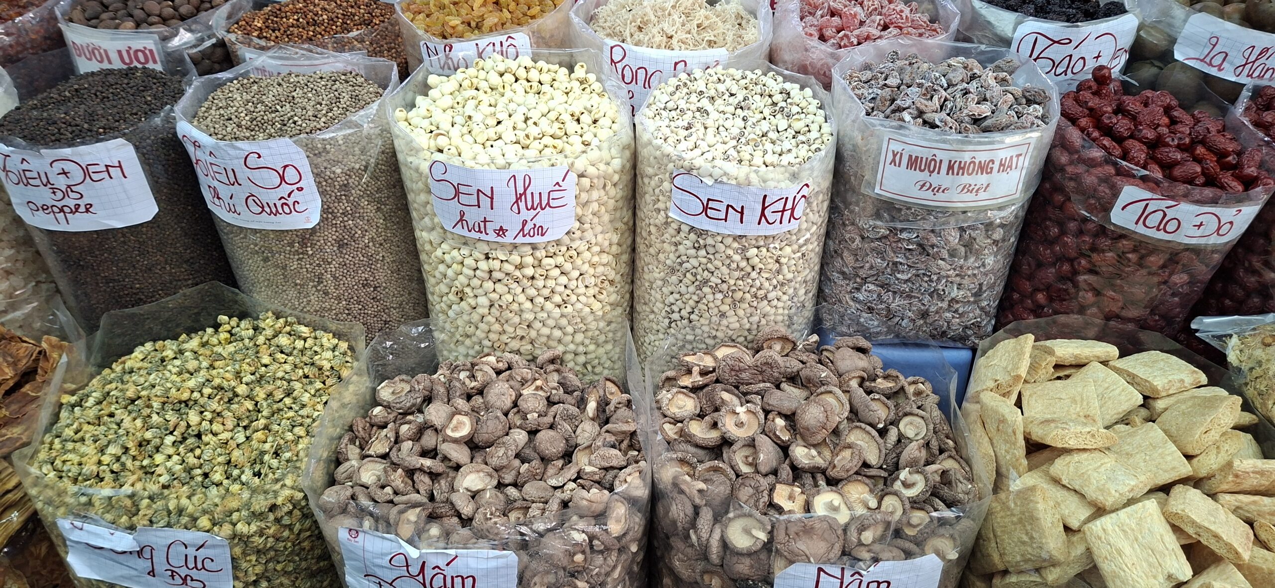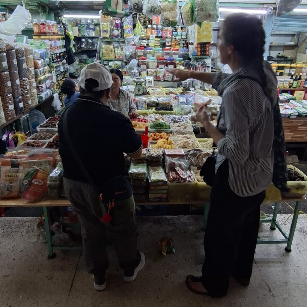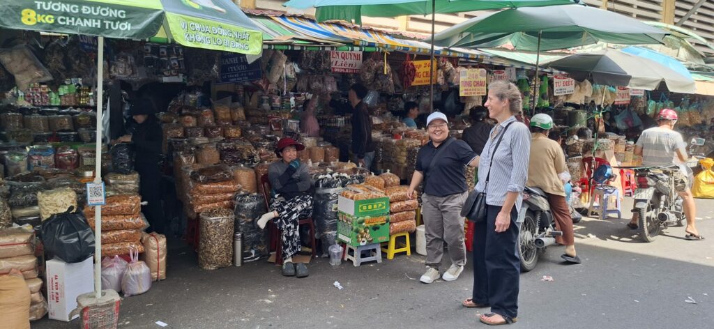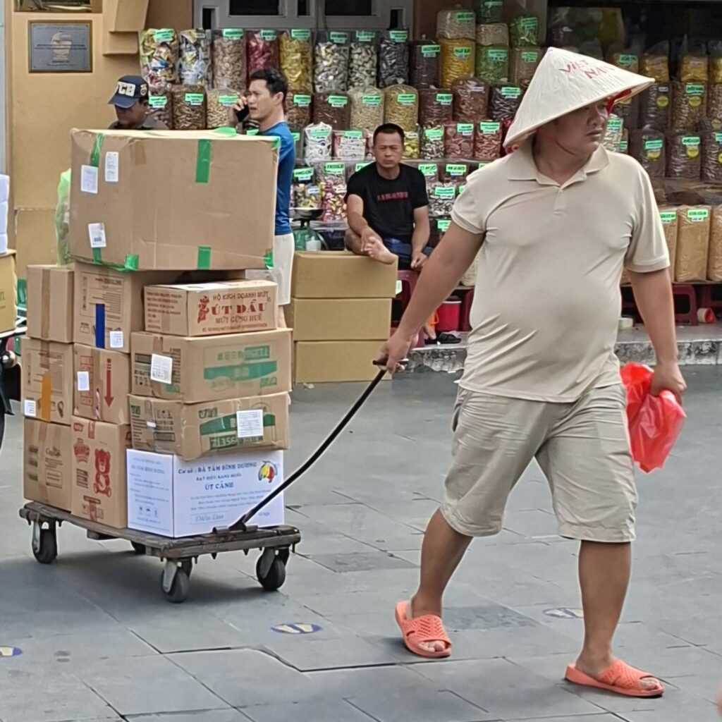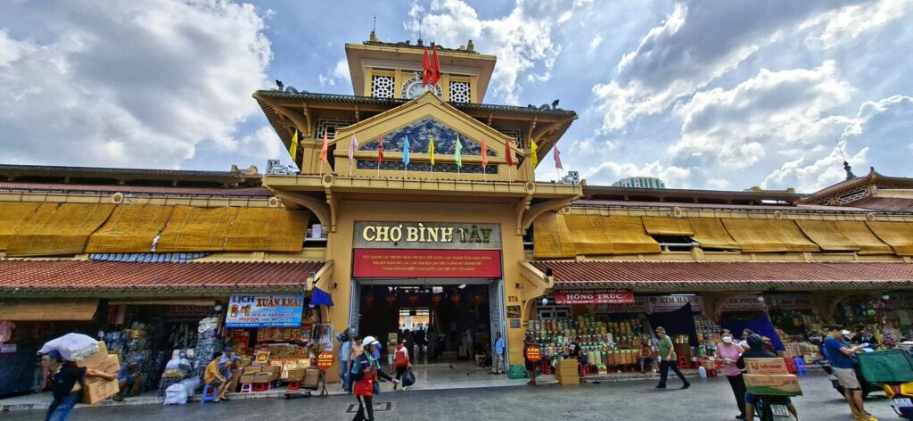 On continue notre périple par la visite (et un repas) au Binh Tay Market, dans le quartier chinois de Cholon. Le repas nous a tout de suite coûté 6€… pour trois 🤯 Benoit a bu sa 333 à la japonaise, c’est-à-dire dans un verre rempli de glaçons (à l’eau minérale, enfin… on espère !) Sinon, on y trouve de tout, mais surtout n’importe quoi. Reno, Marie a acheté des kits (bouillon et épices) pour faire du pho.