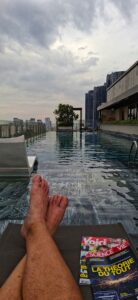 On rentre à pied à l’hôtel ; il est presque 17h. On monte sur le toit, à la piscine. La chaleur est toujours là alors que le soleil tombe… c’est gai!