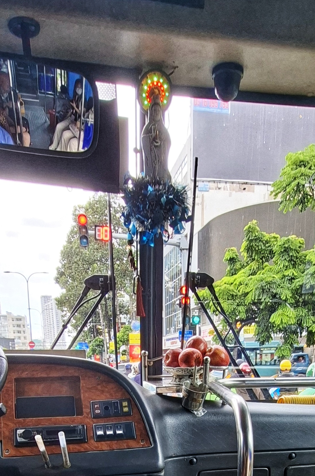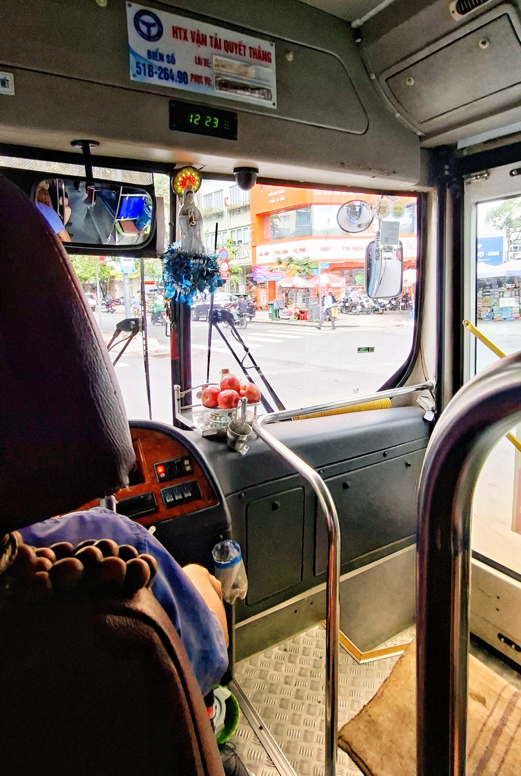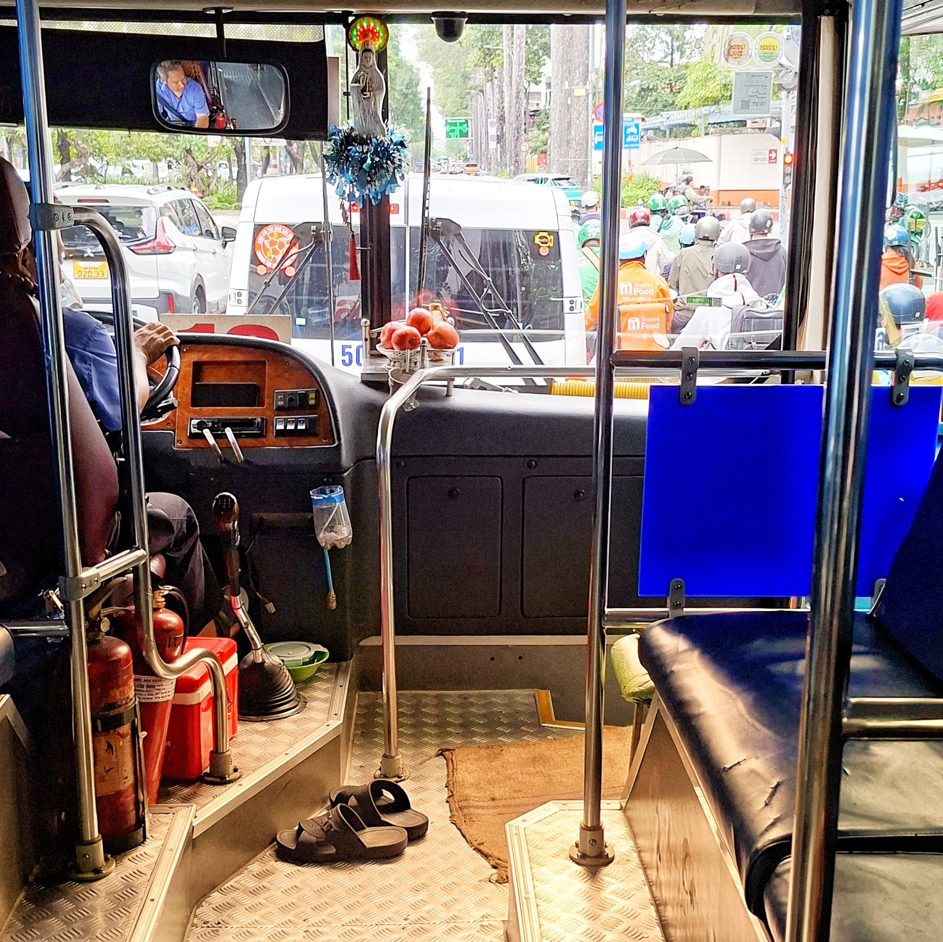 Quand on rentre dans le premier bus, il ne s’arrête pas. Il faut le prendre en marche, si, si ! On paie notre ticket 7000Dongs chacun (une vingtaine de cents). On a eu le temps d’admirer le paysage mais aussi l’intérieur du bus qui semble être la maison du chauffeur. Il a tout ce qu’il faut à portée de mains : brosse à dents, dentifrice, tenue de rechange, hôtel pour divinités, vaisselle, poubelles, … En fait, c’est comme un motorhome. Tous les bus de la journée n’étaient pas comme ça, mais c’était le plus typique.