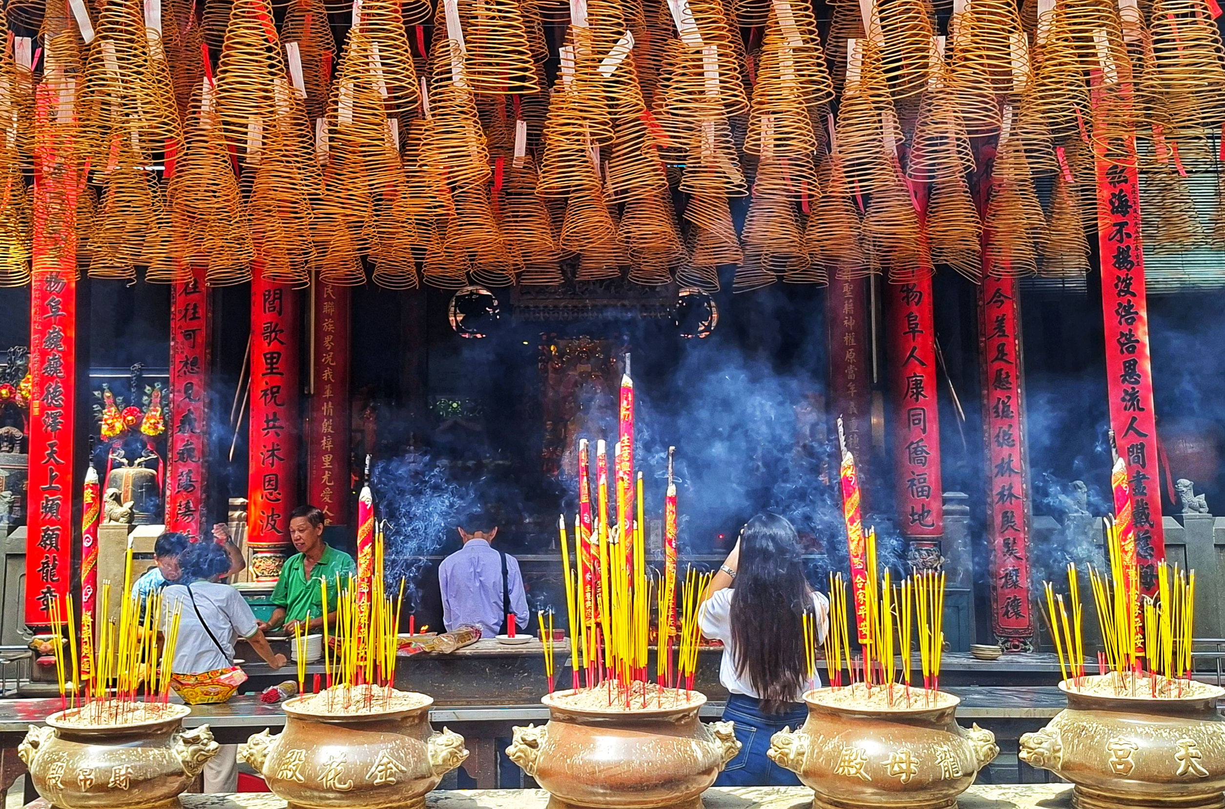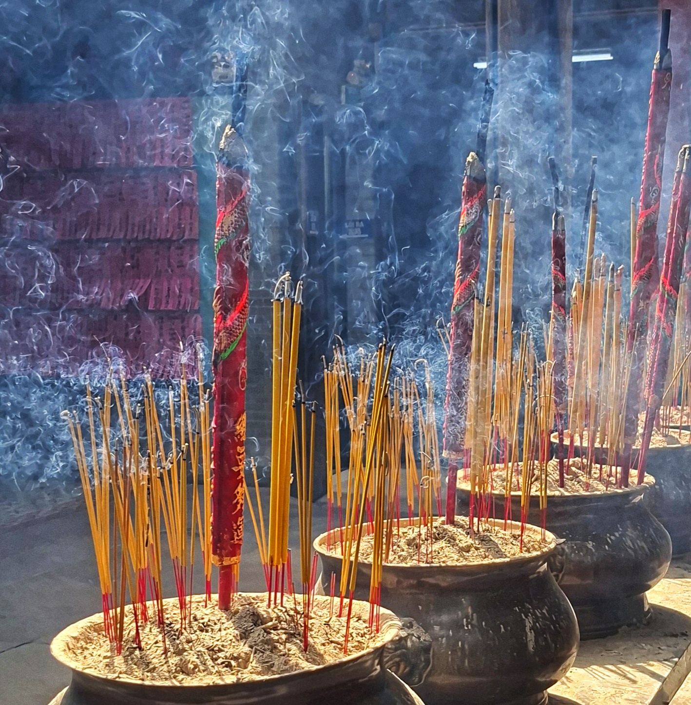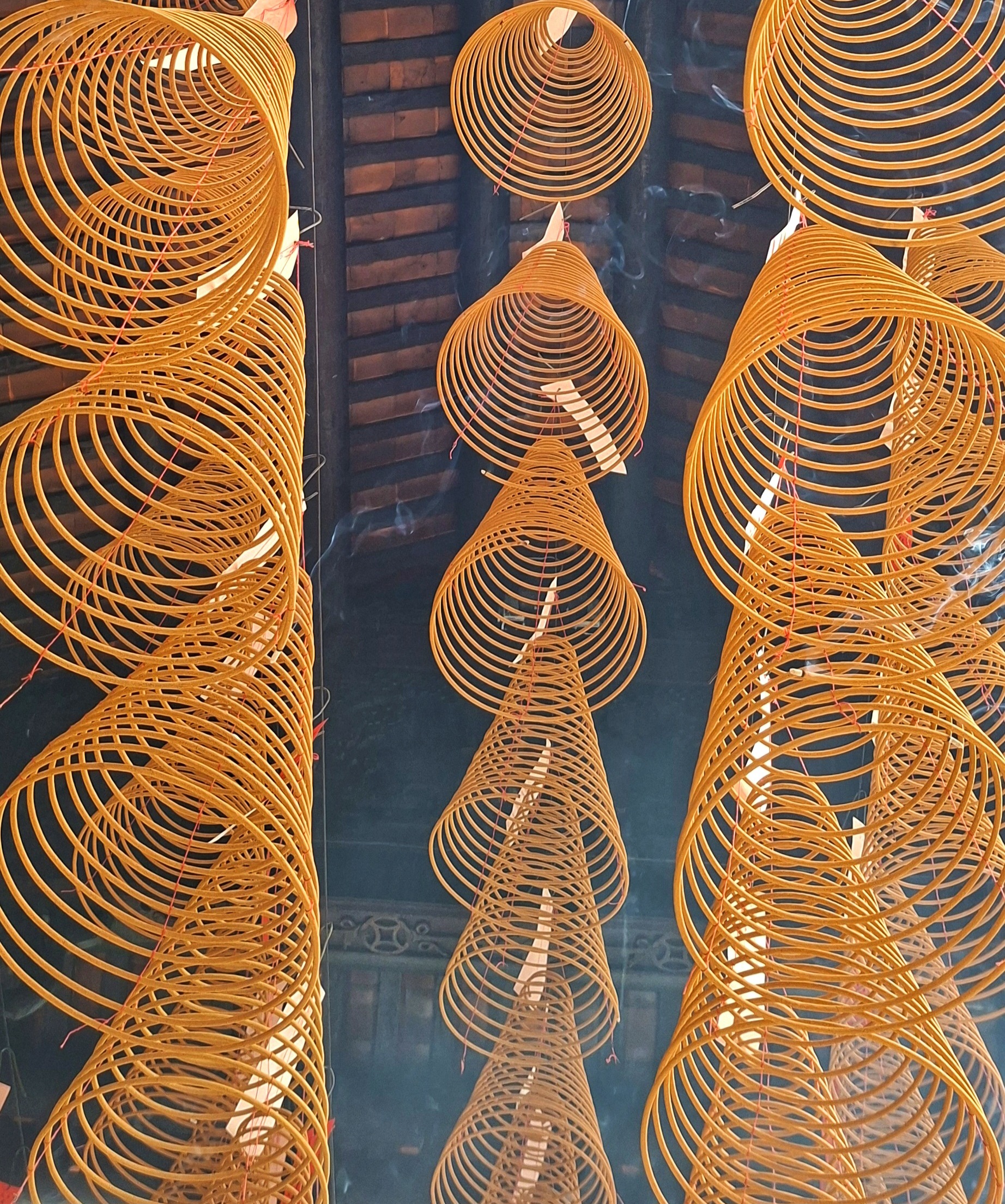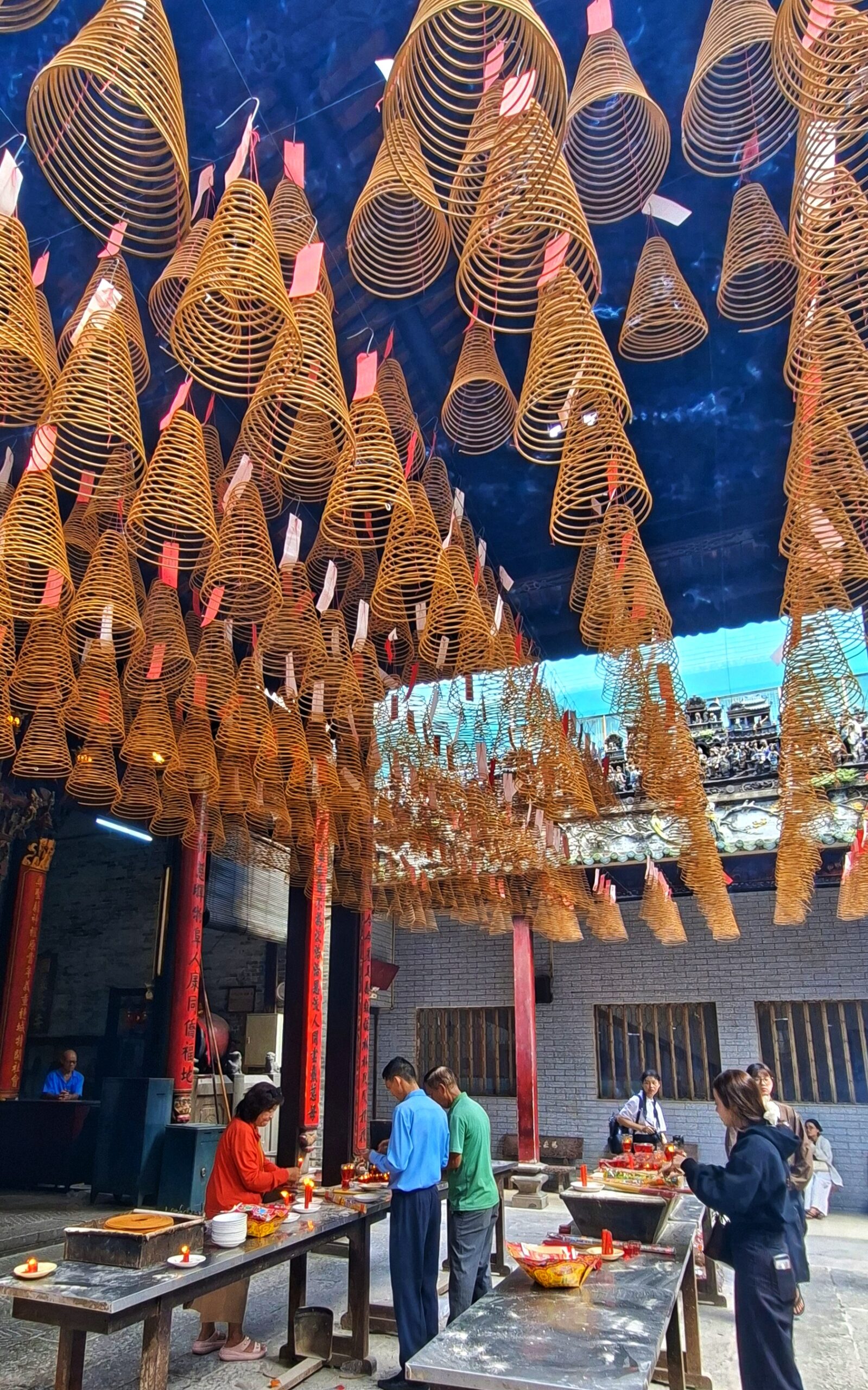 On se rend donc dans le quartier de Cholon (où nous étions hier, oui) pour aller admirer un grand temple qui était passé sous le radar de notre guide: Thien Hau Pagoda. Encore des photos d’encens et de bougies 🤣