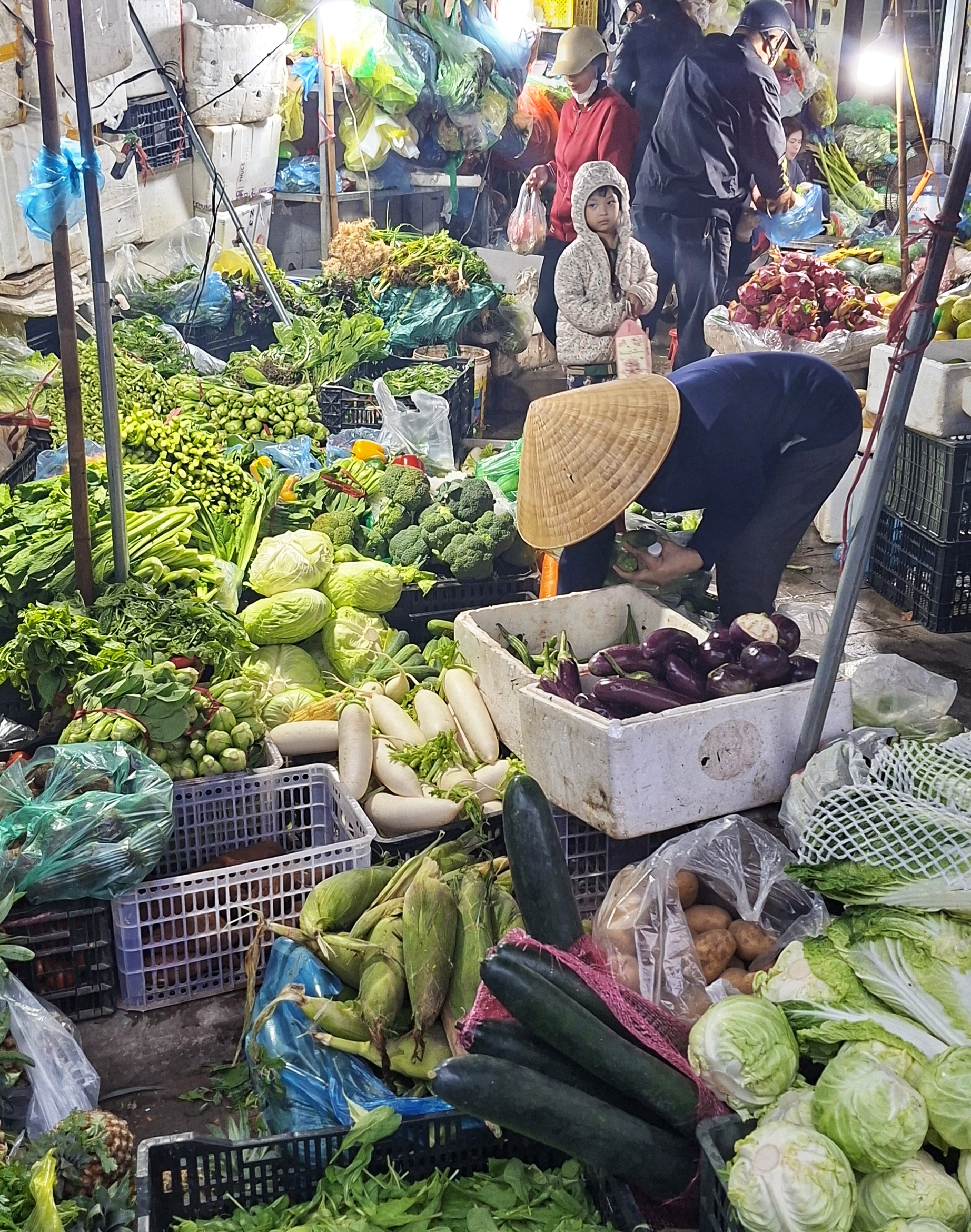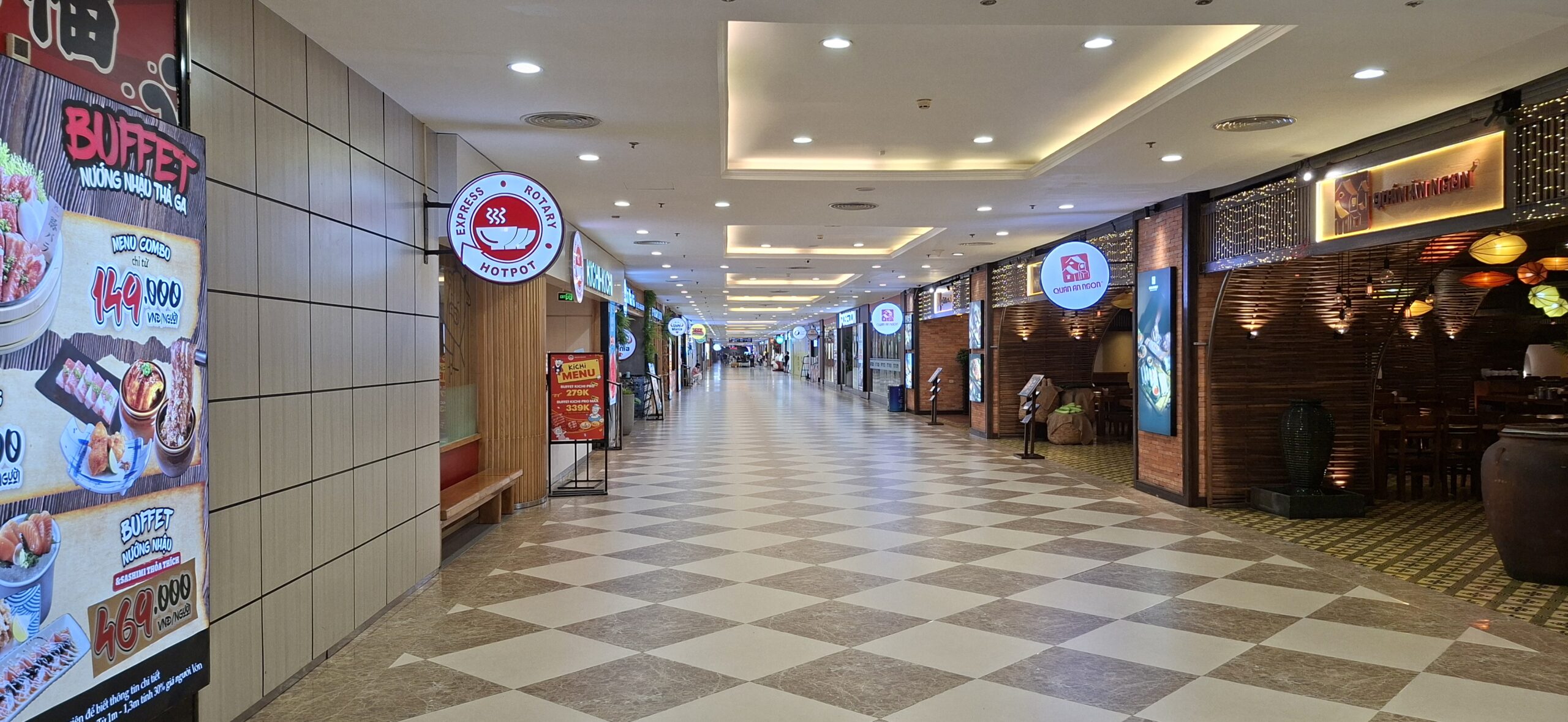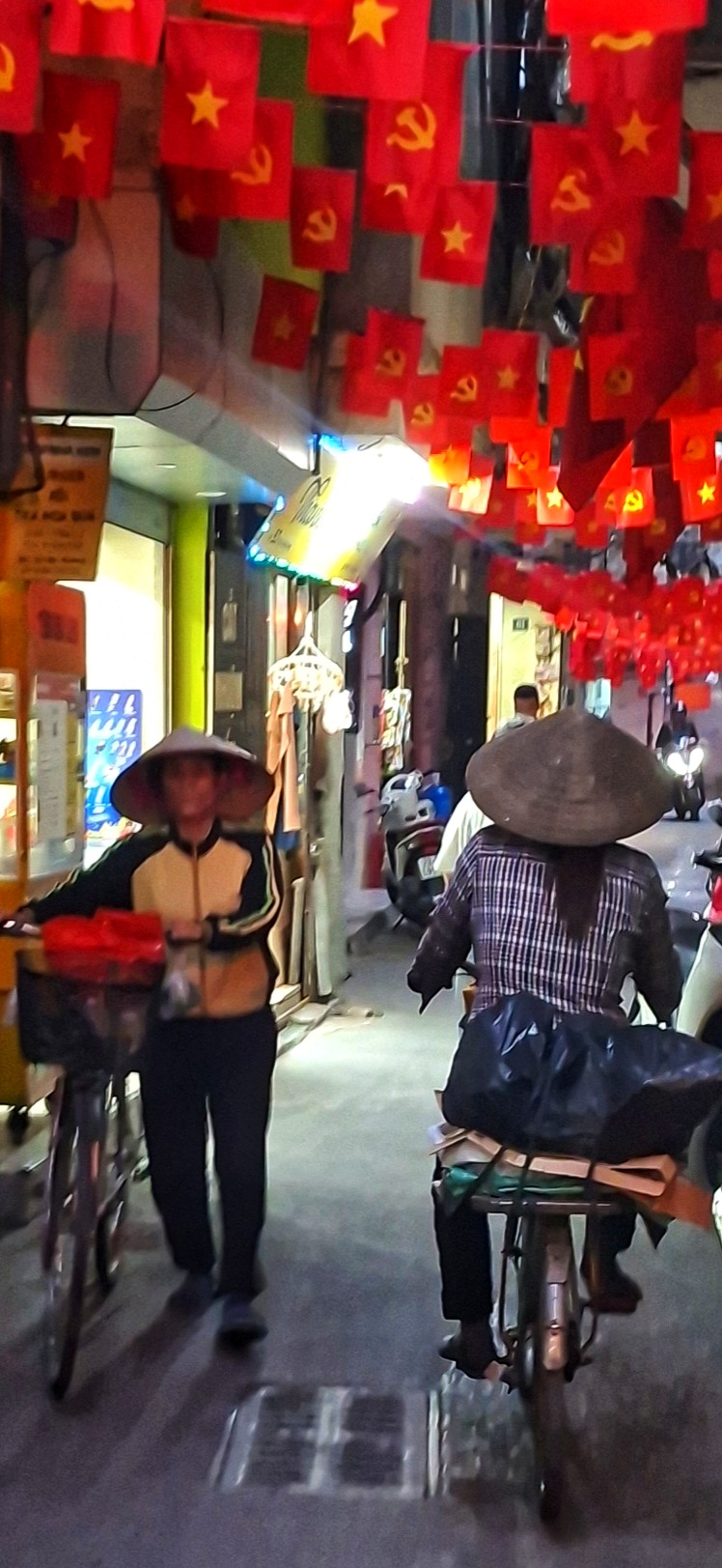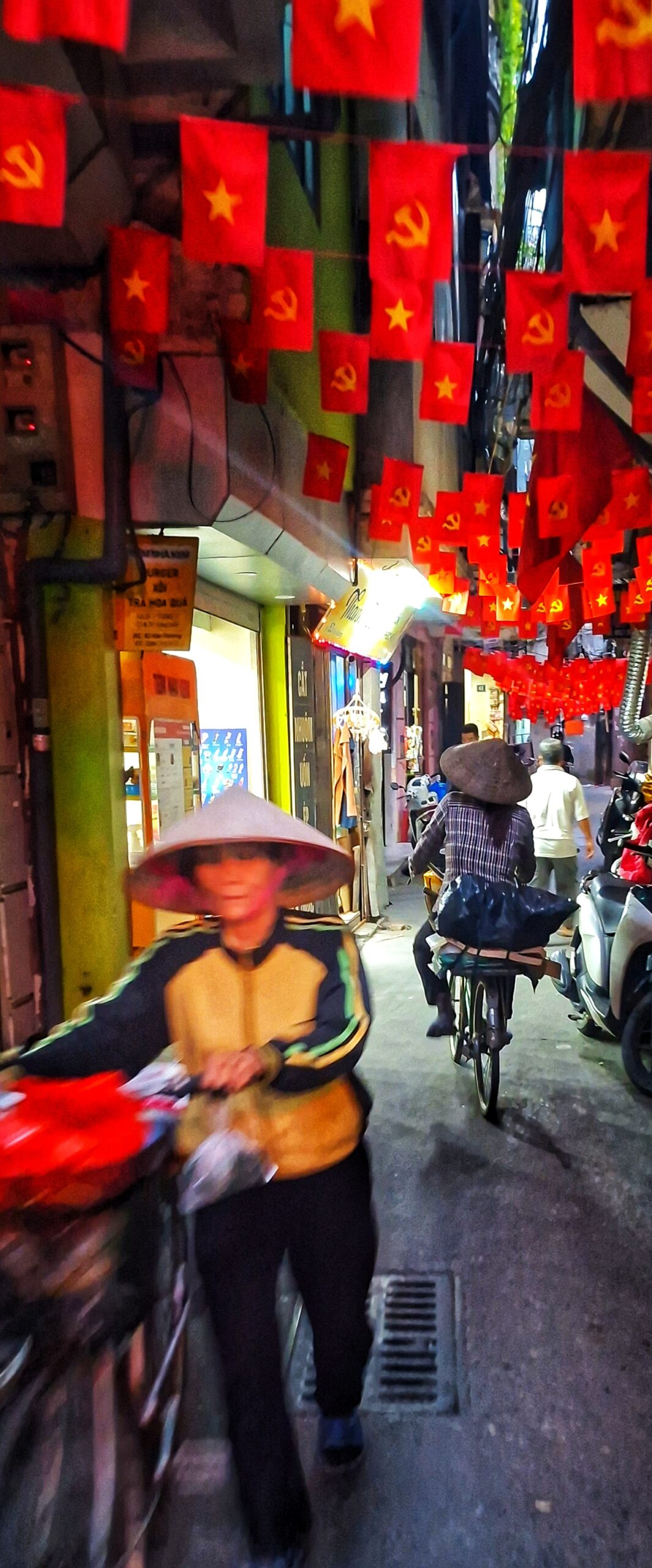 On profite quand même de notre présence sur place pour manger dans un des très, très, très nombreux restos de la galerie. On essaie de commander dans un premier ; le menu est exclusivement en vietnamien, la conversation aussi, notre commande ne convient pas, on s’en va… Dans le second, le menu est bilingue vn/en, on commande, on se lèche les babines! Et je bois une autre bière avec des glaçons…