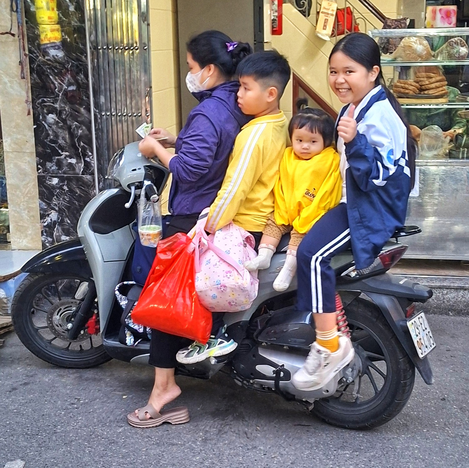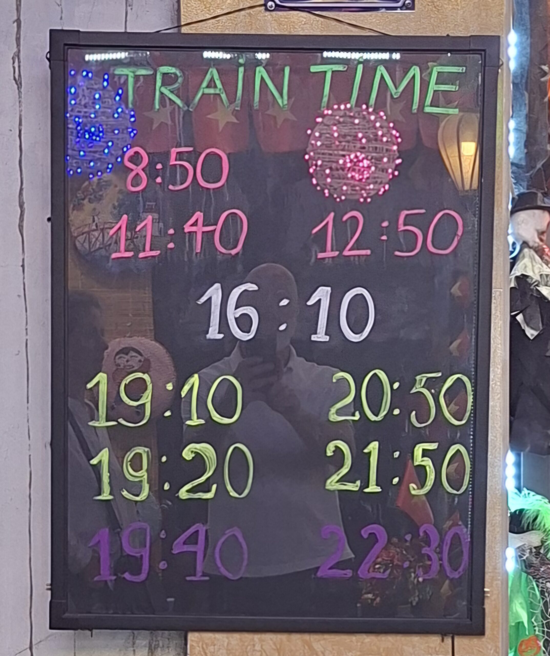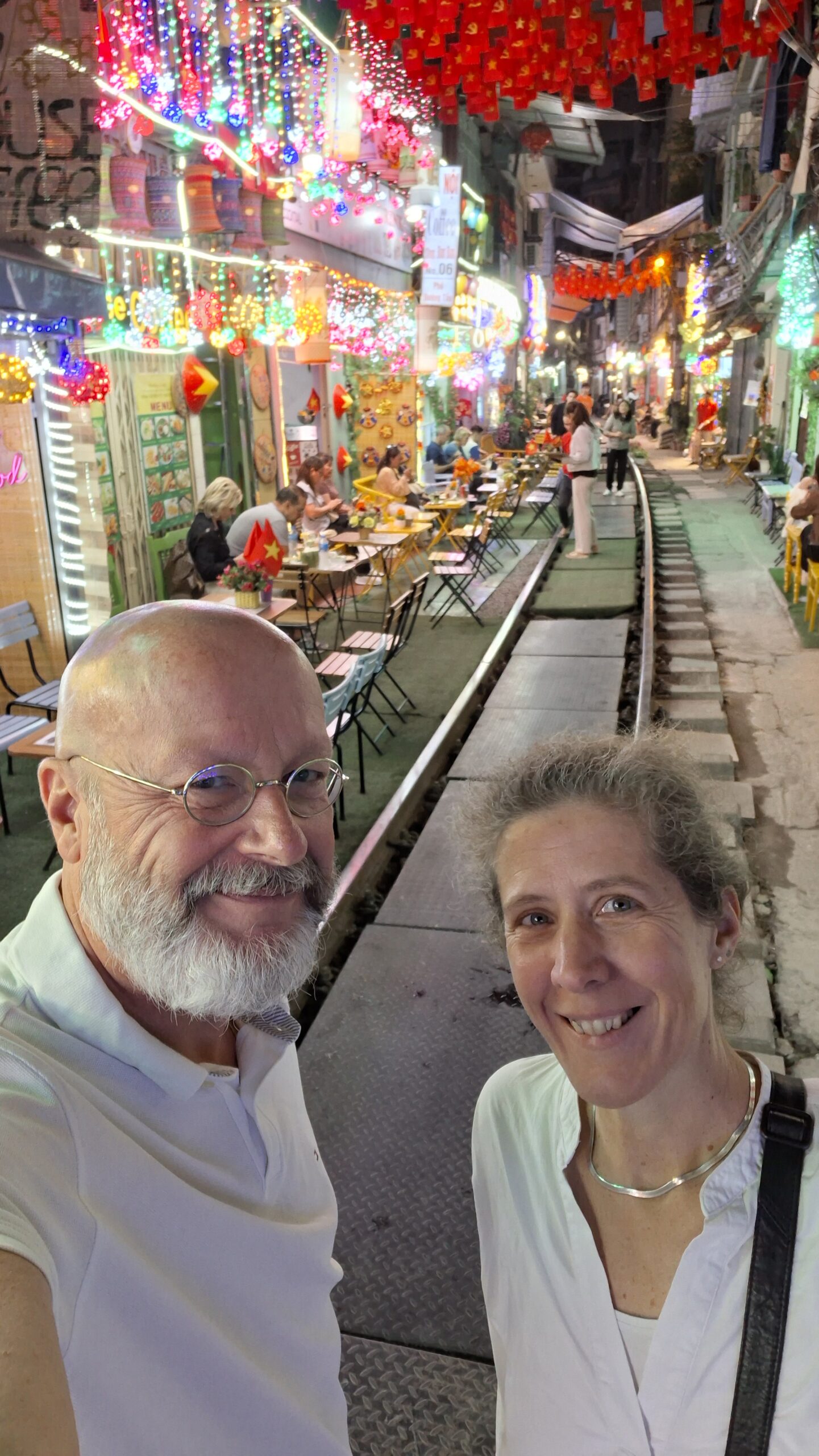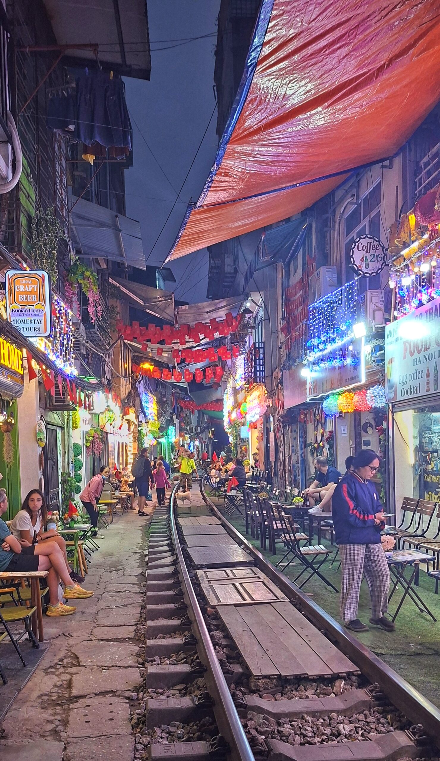 A la sortie, on décide de rejoindre Train street. On aurait peut-être dû se renseigner sur les horaires avant 😝 Pas de train prévu avant plus d’une heure et demie. Pas grave, le trajet jusque là en valait la peine à lui seul : ruelles étroites embouteillées par scooters, petites échoppes (dont l’une vendait clairement de la viande de chien), coiffeurs (on se fait laver les cheveux complètement couché, ici), école maternelle de quartier, etc. Peut-être qu’on y retournera demain midi…