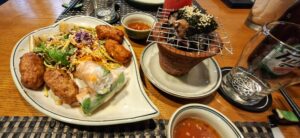 On cherche un resto. On trouve. On y va. On est mouillé. On est très mouillé. Marie a anticipé ; elle a mis ses flip-flops. Moi pas…. Le resto, Spices Viet, est avenant. On commande le menu dégustation pour 2: facile 😊 Je re-goute au plaisir d’un Long Island Ice tea. Marie a trouvé sa boisson du voyage: le watermelon juice (jus de pastèque); elle en prend quand il y en a sur la carte… Le plat choisi est dé-li-cieux mais un peu frugal. On recommande un petit quelque chose 😉 On ne va pas se laisser mourir de faim, hein, Mireille!?