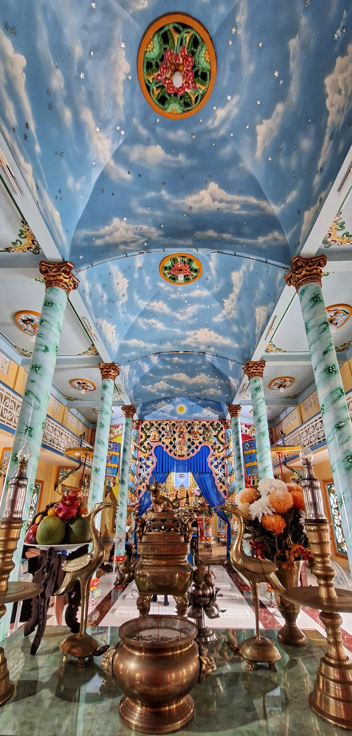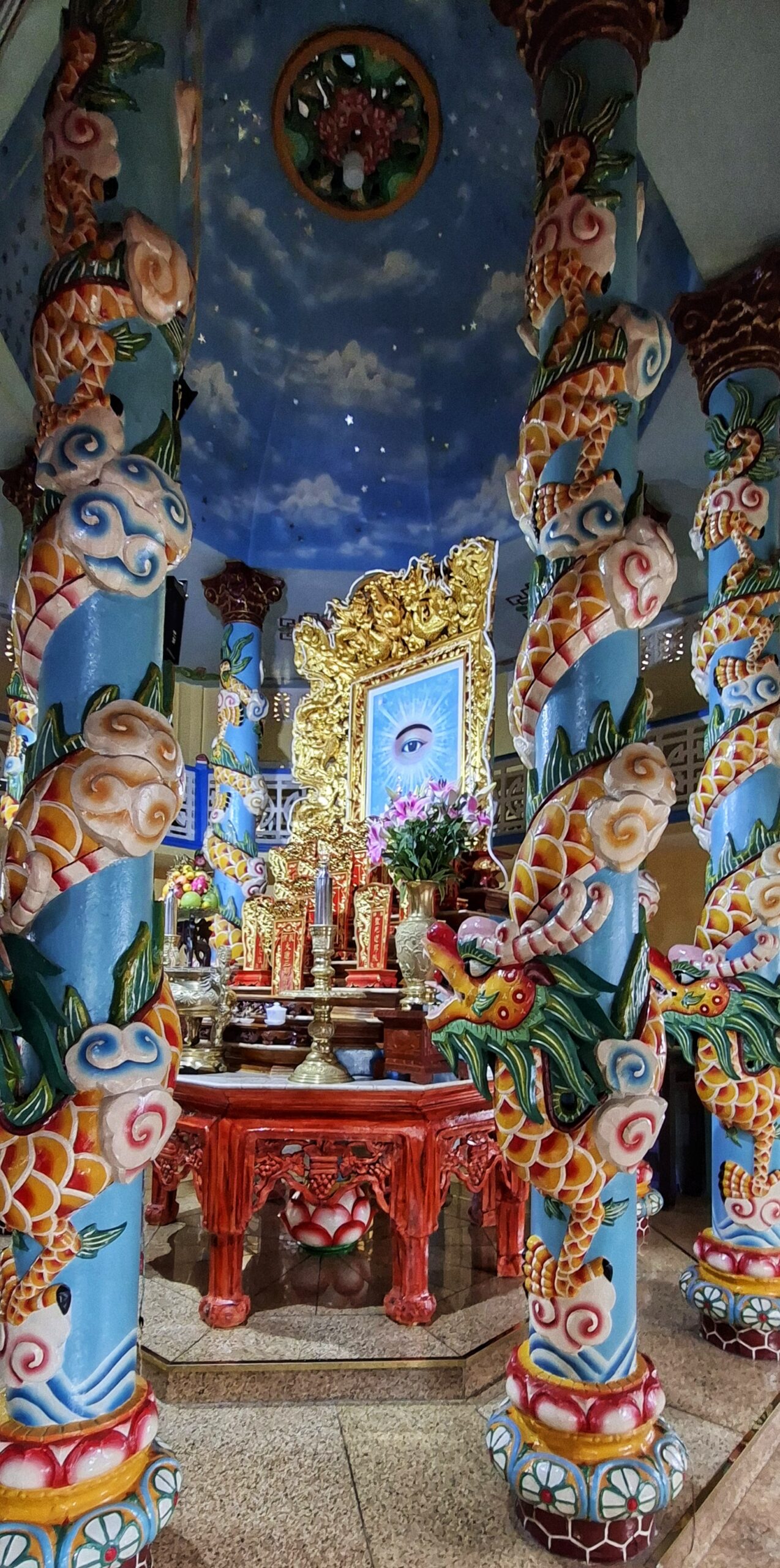 On termine avec une « église » Cao Dai, où Victor Hugo est vénéré tel un Saint. Encore plus coloré!