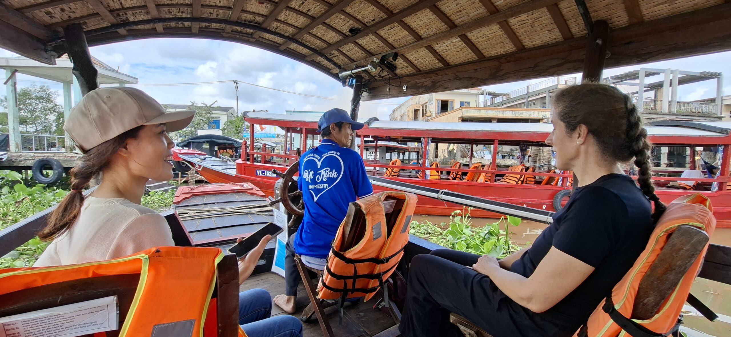 Aujourd’hui, on nous a fait lever tôt! On demarre notre journée à 8h30, avec notre guide pour la journée , Phuong. Comme l’agence n’avait pas pu nous fournir l’ensemble des services prévus au centre du Vietnam, elle nous a proposé cette journée dans le Delta du Mekong en « compensation ».