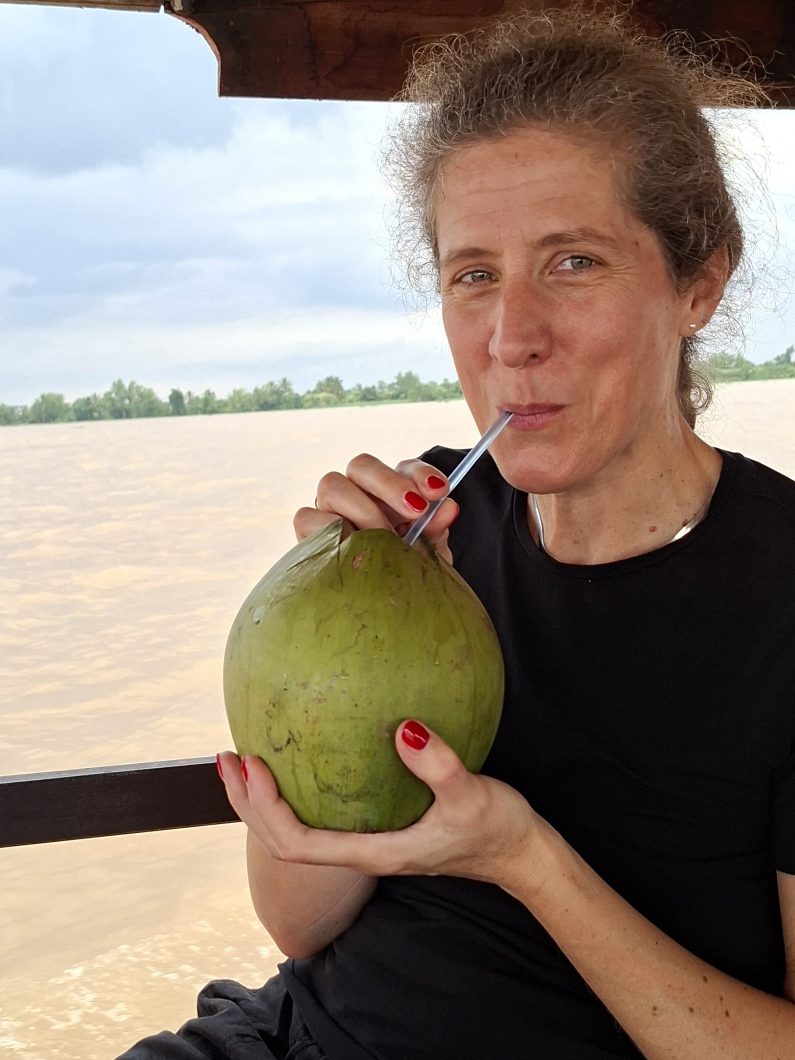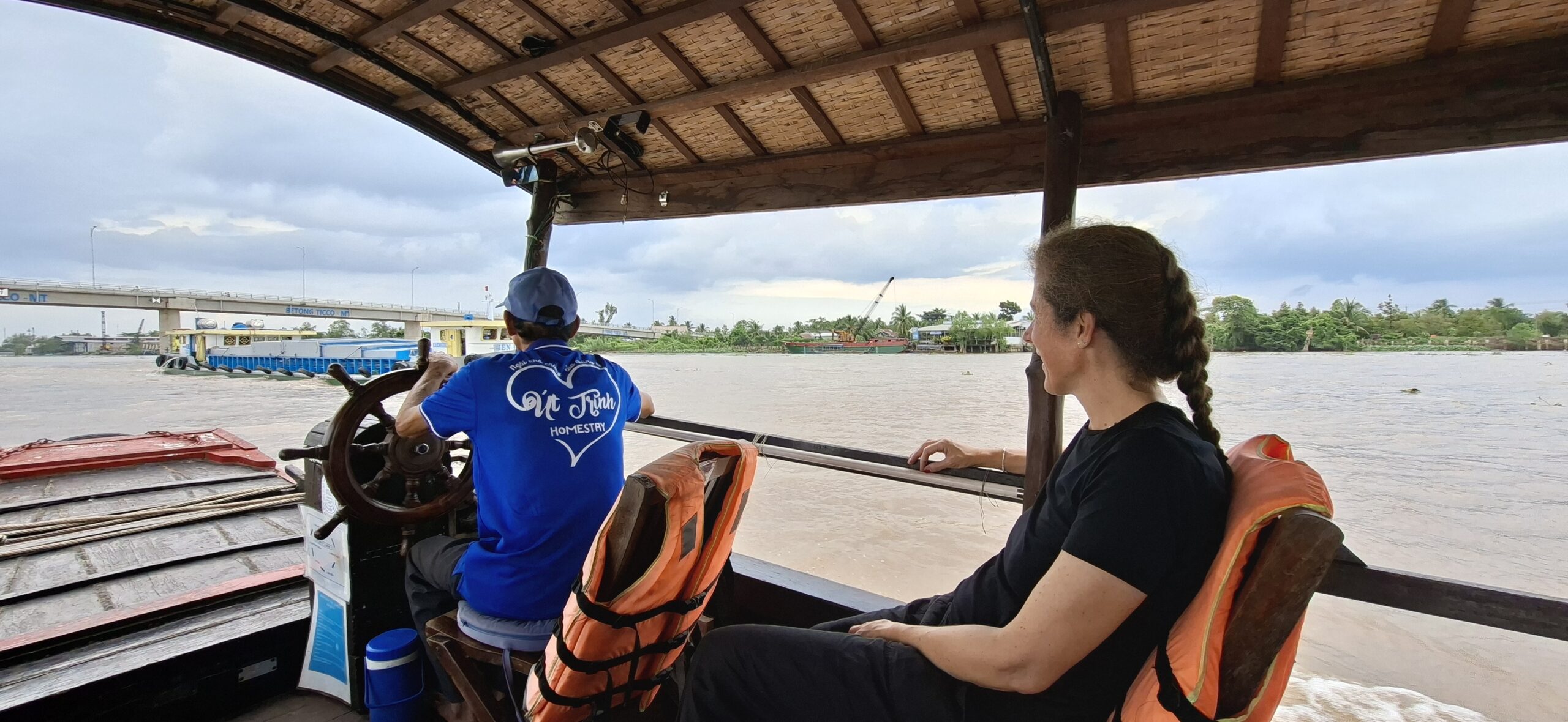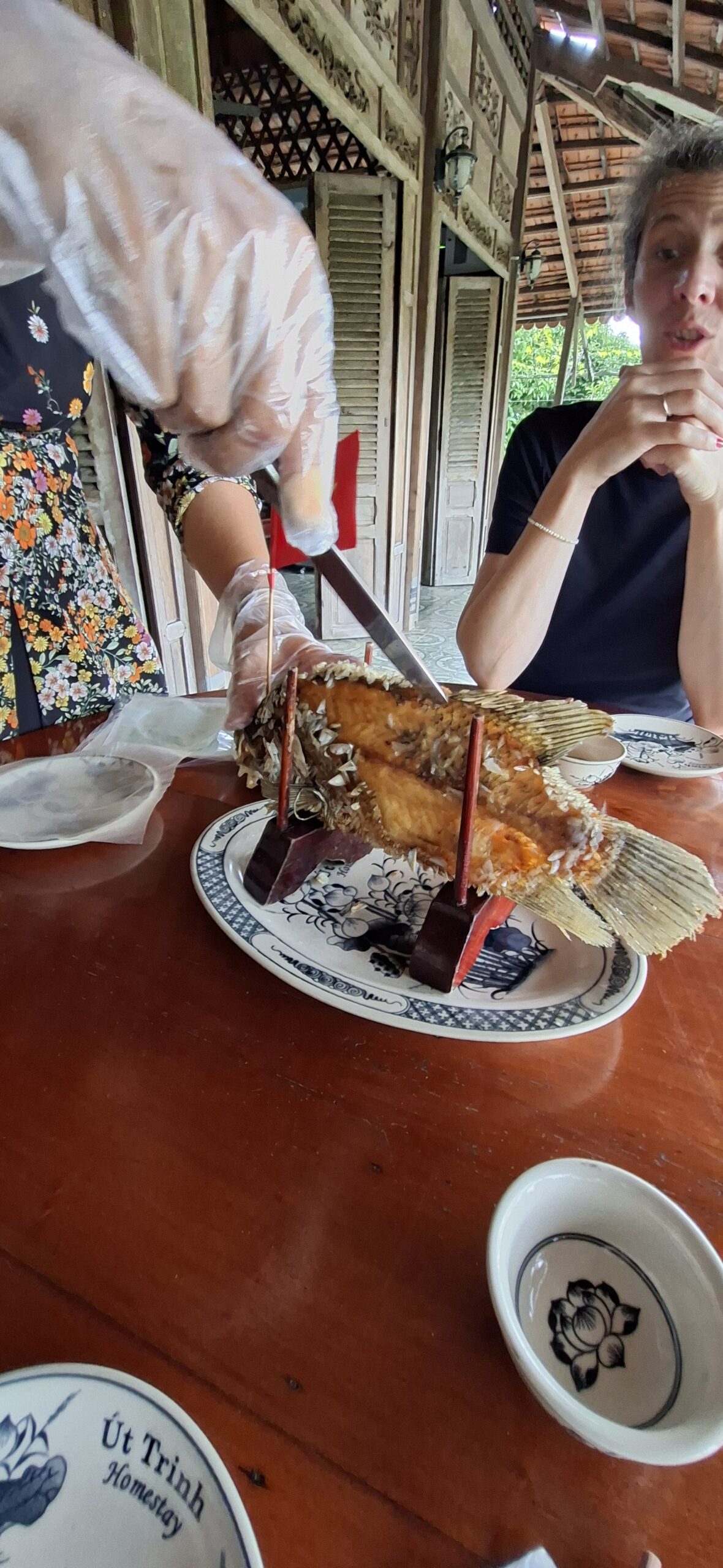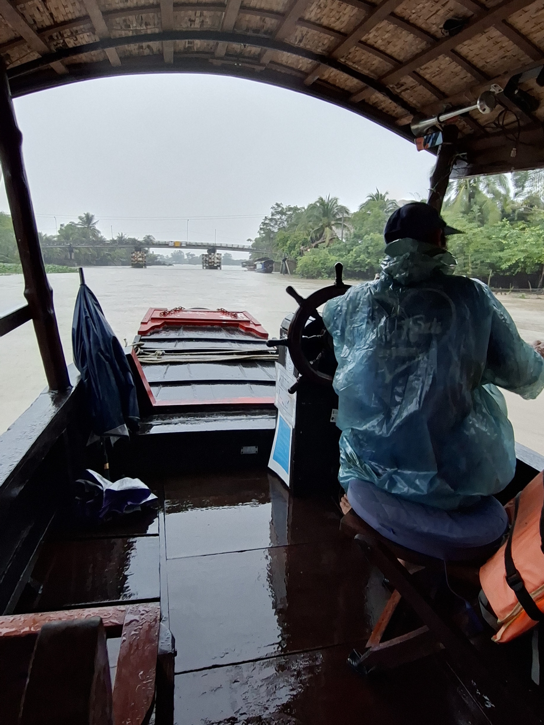 Quitter HCMV prend un certain temps. Il nous faut 2h30 pour atteindre notre première étape. Nous montons dans un bateau, rien que pour nous. On visite un espace où différents produits locaux sont fabriqués: galettes de riz, riz soufflé, alcool de riz, caramels, etc. On fait quelques petits achats (qui seront noyés par un orage un peu plus tard dans la journée). On traverse un zone humide en pirogue. Marie goûte le contenu d’une noix de coco fraîche. On atteint ensuite la guesthouse familiale où nous prenons notre repas (7 services). Et c’est à la fin du repas qu’il commence à pleuvoir… un peu… beaucoup… à torrent! On est bloqué dans la guesthouse, et on attend que ça passe 🤗 Ça ne passe pas 😝