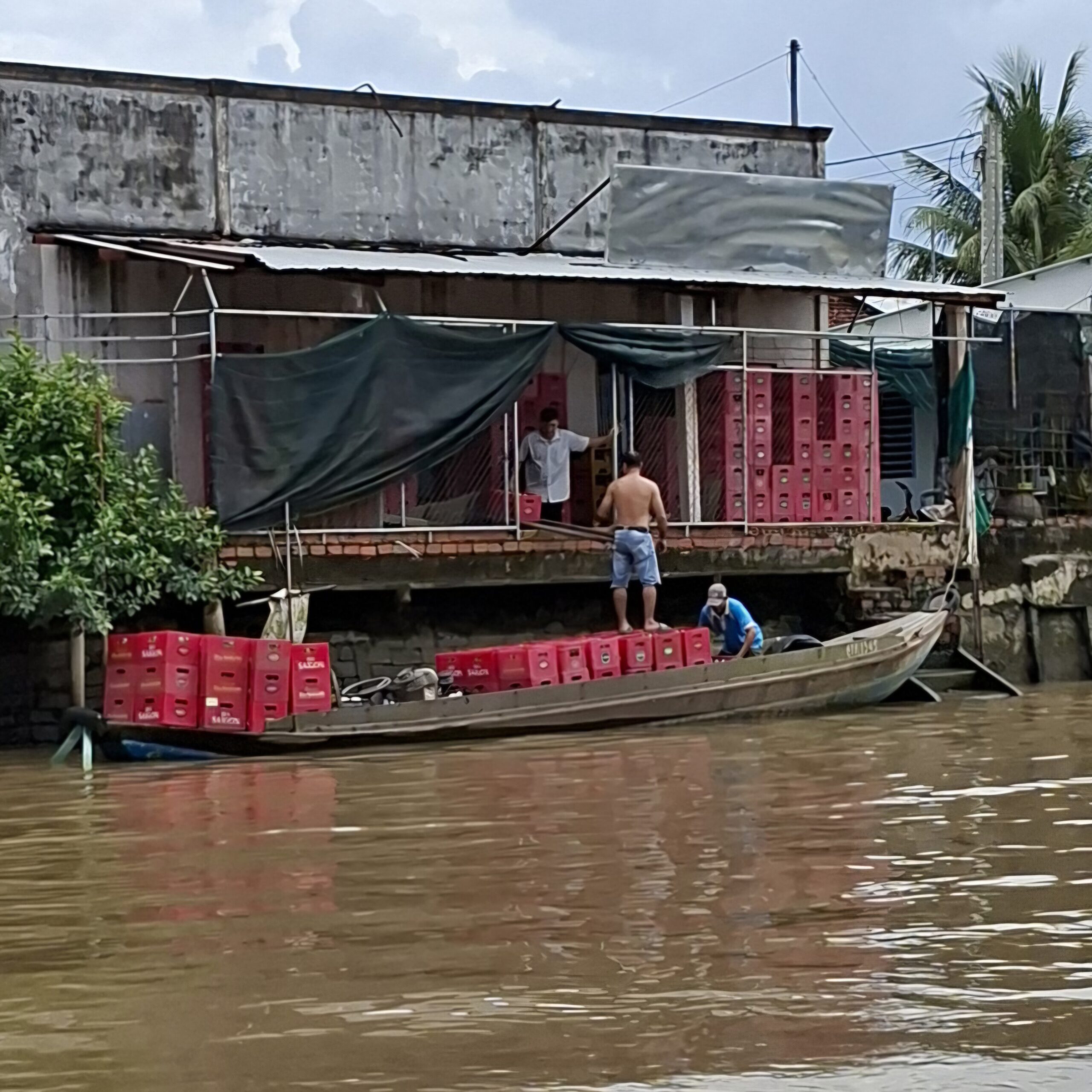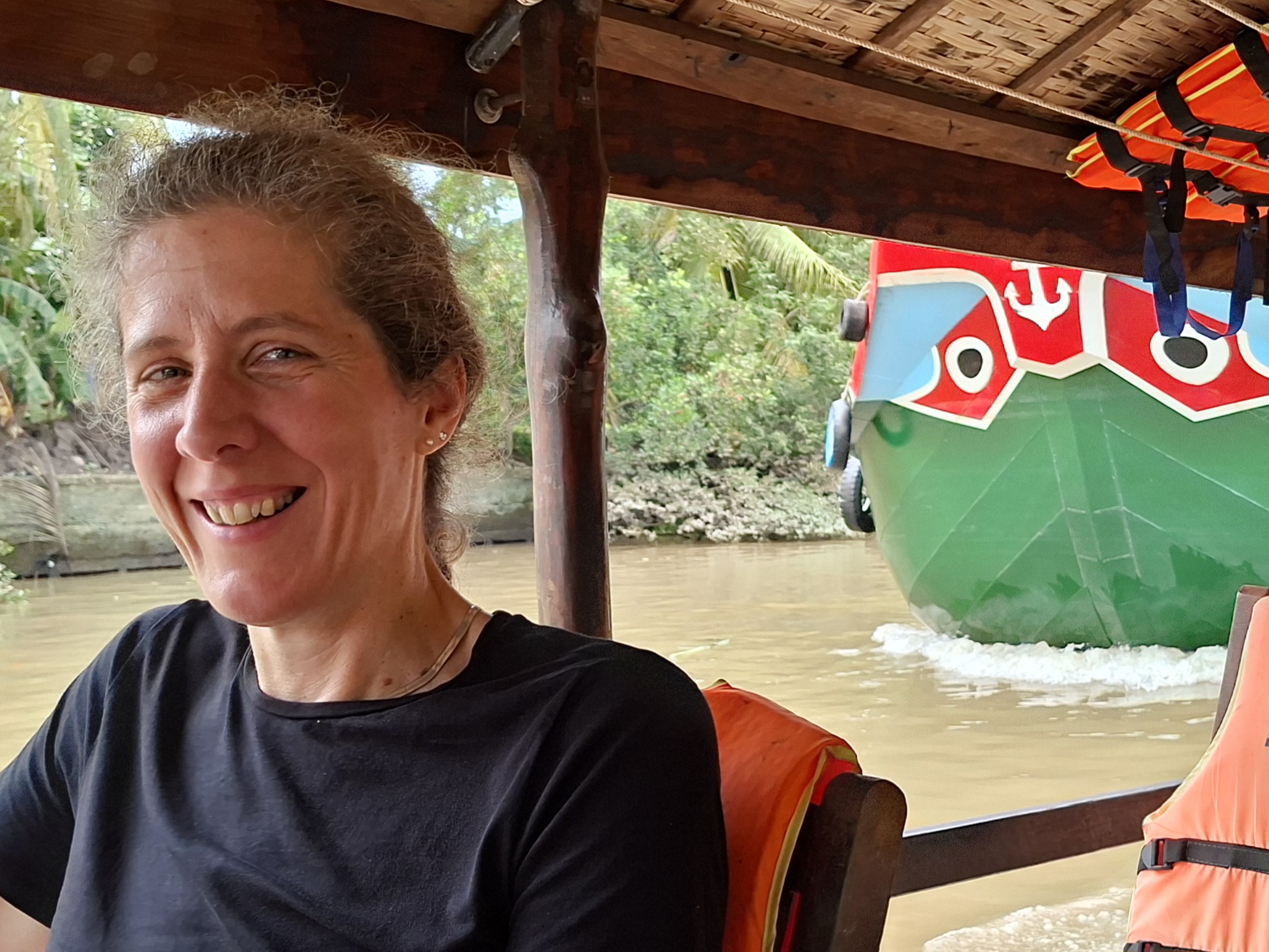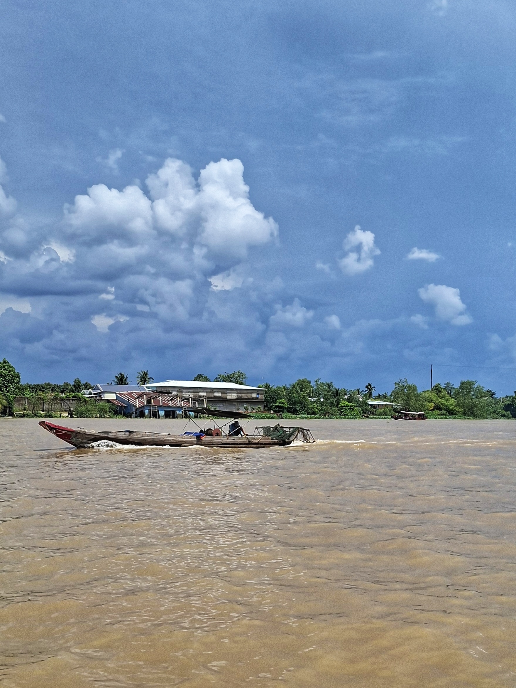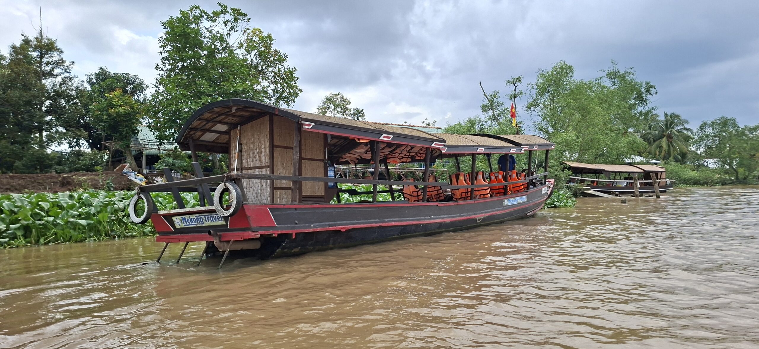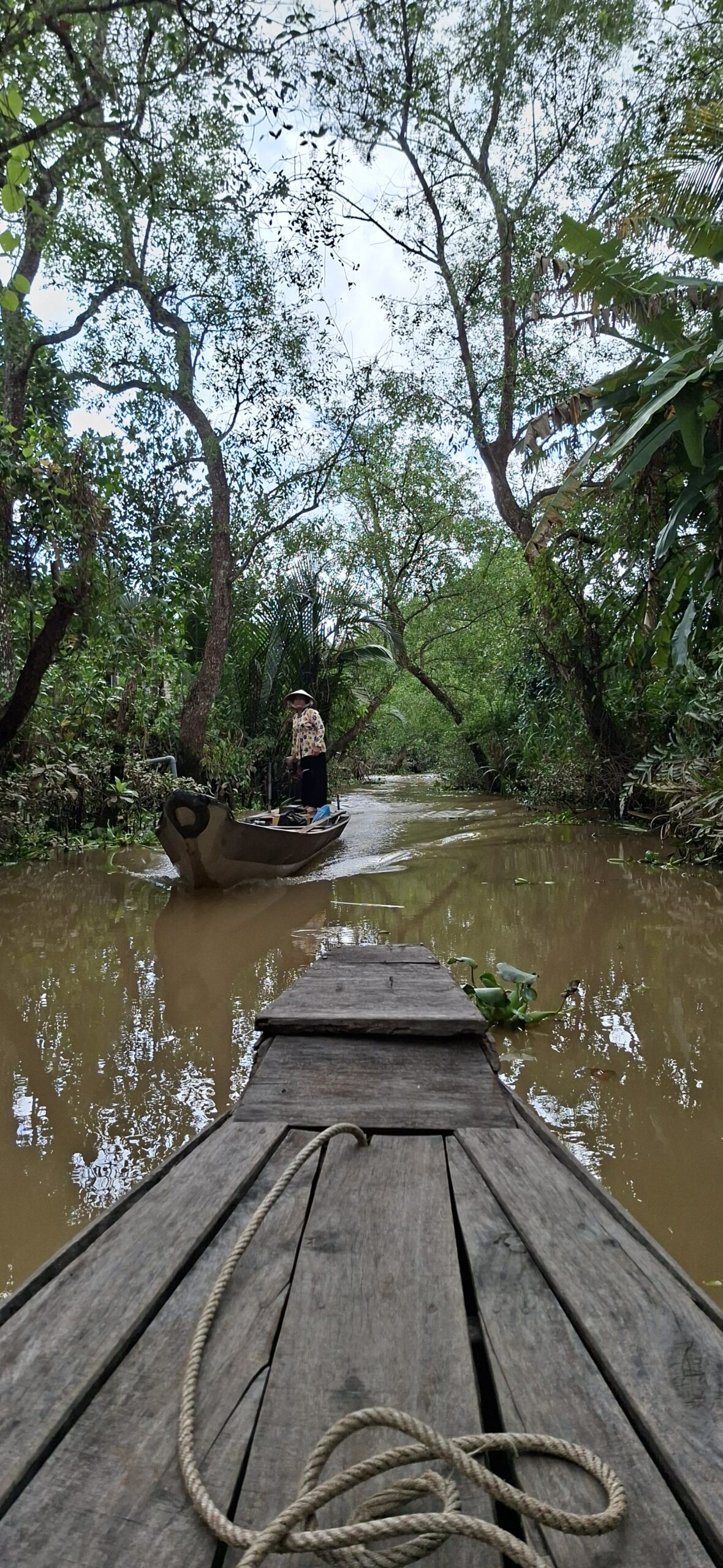 Quitter HCMV prend un certain temps. Il nous faut 2h30 pour atteindre notre première étape. Nous montons dans un bateau, rien que pour nous. On visite un espace où différents produits locaux sont fabriqués: galettes de riz, riz soufflé, alcool de riz, caramels, etc. On fait quelques petits achats (qui seront noyés par un orage un peu plus tard dans la journée). On traverse un zone humide en pirogue. Marie goûte le contenu d’une noix de coco fraîche. On atteint ensuite la guesthouse familiale où nous prenons notre repas (7 services). Et c’est à la fin du repas qu’il commence à pleuvoir… un peu… beaucoup… à torrent! On est bloqué dans la guesthouse, et on attend que ça passe 🤗 Ça ne passe pas 😝