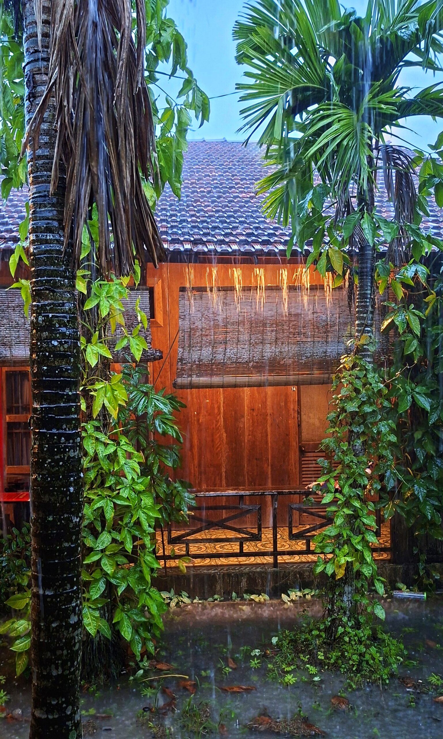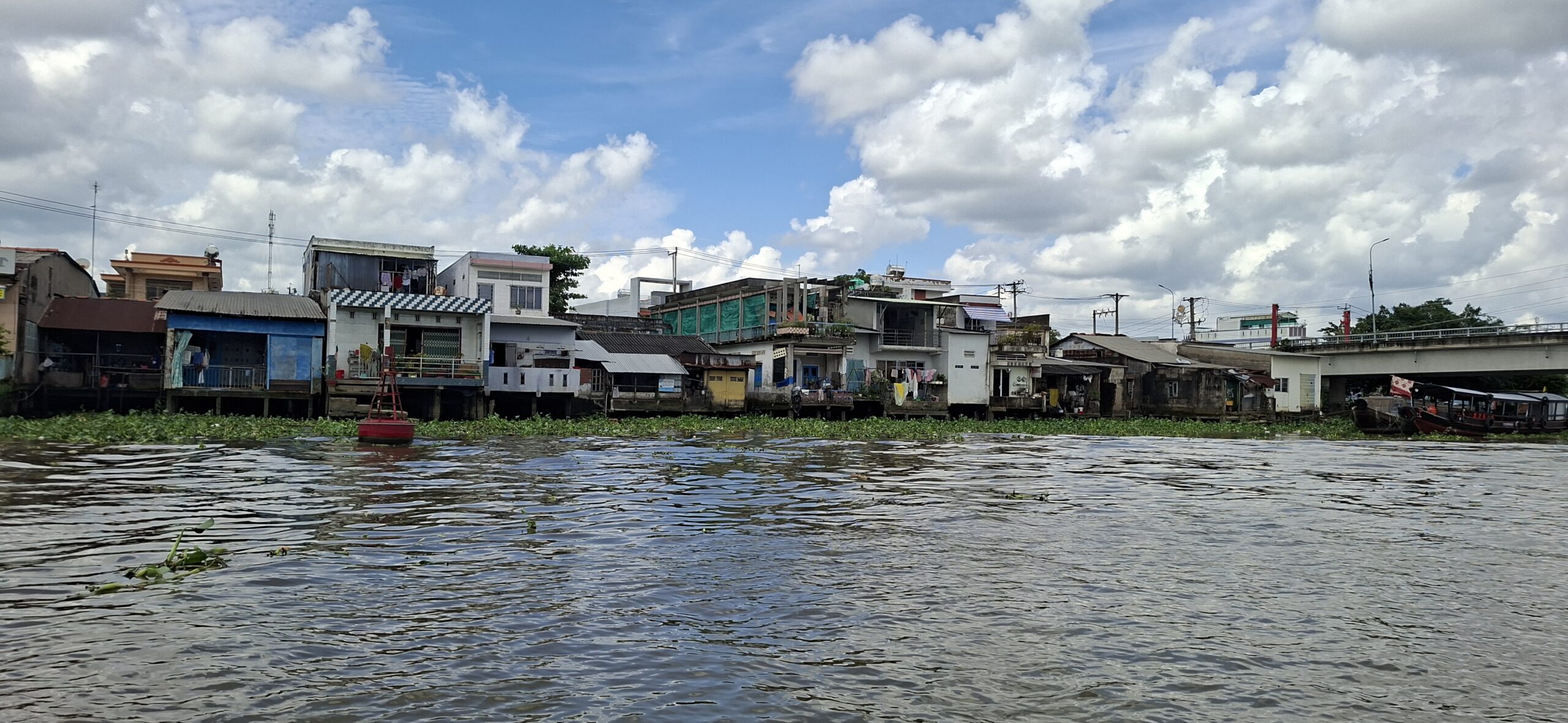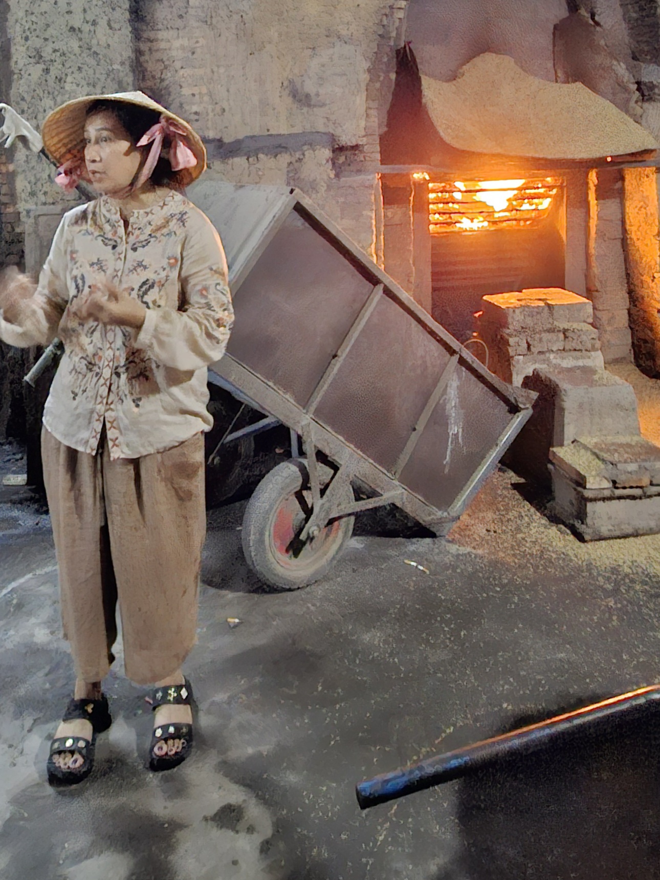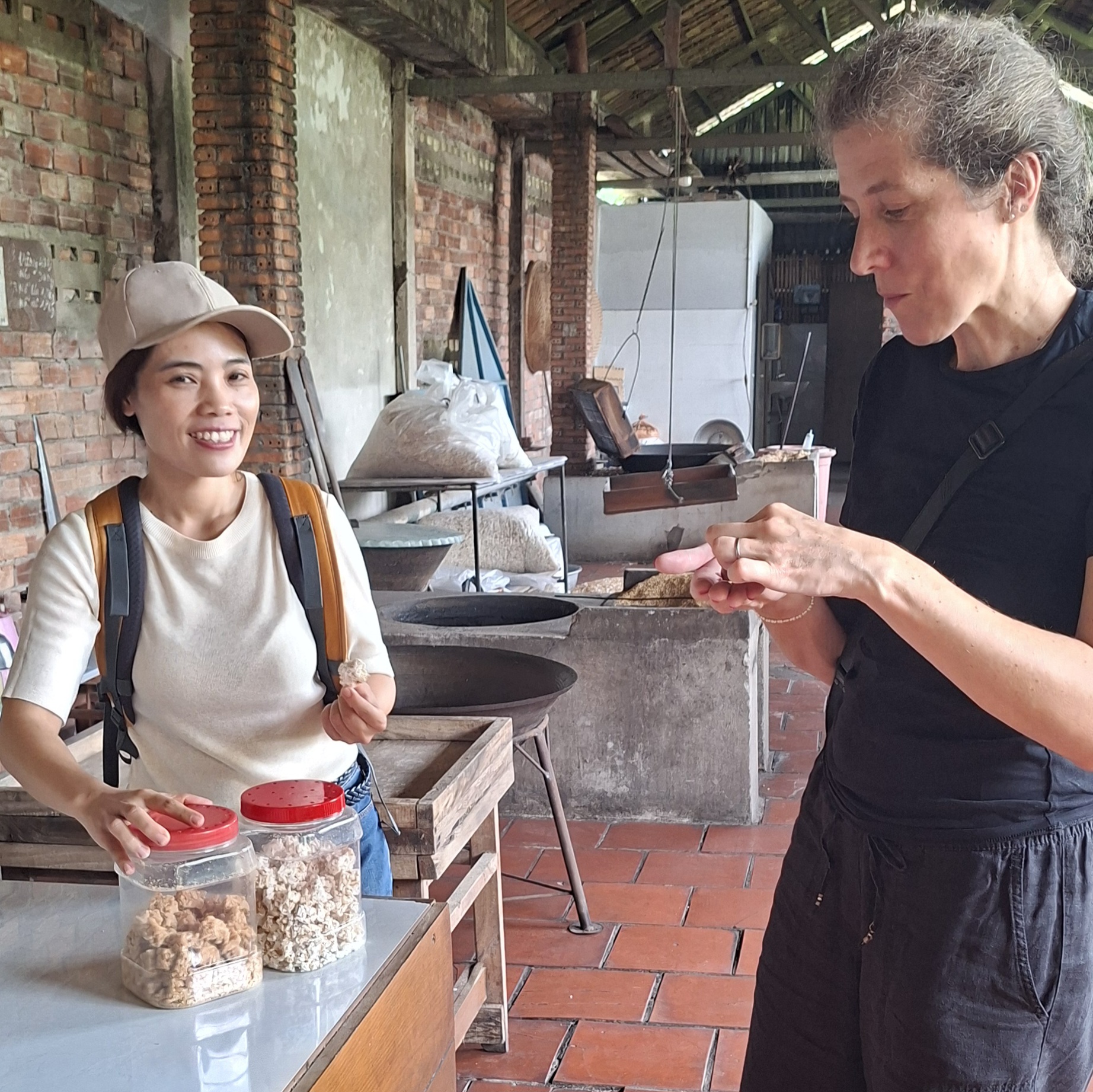 Quitter HCMV prend un certain temps. Il nous faut 2h30 pour atteindre notre première étape. Nous montons dans un bateau, rien que pour nous. On visite un espace où différents produits locaux sont fabriqués: galettes de riz, riz soufflé, alcool de riz, caramels, etc. On fait quelques petits achats (qui seront noyés par un orage un peu plus tard dans la journée). On traverse un zone humide en pirogue. Marie goûte le contenu d’une noix de coco fraîche. On atteint ensuite la guesthouse familiale où nous prenons notre repas (7 services). Et c’est à la fin du repas qu’il commence à pleuvoir… un peu… beaucoup… à torrent! On est bloqué dans la guesthouse, et on attend que ça passe 🤗 Ça ne passe pas 😝