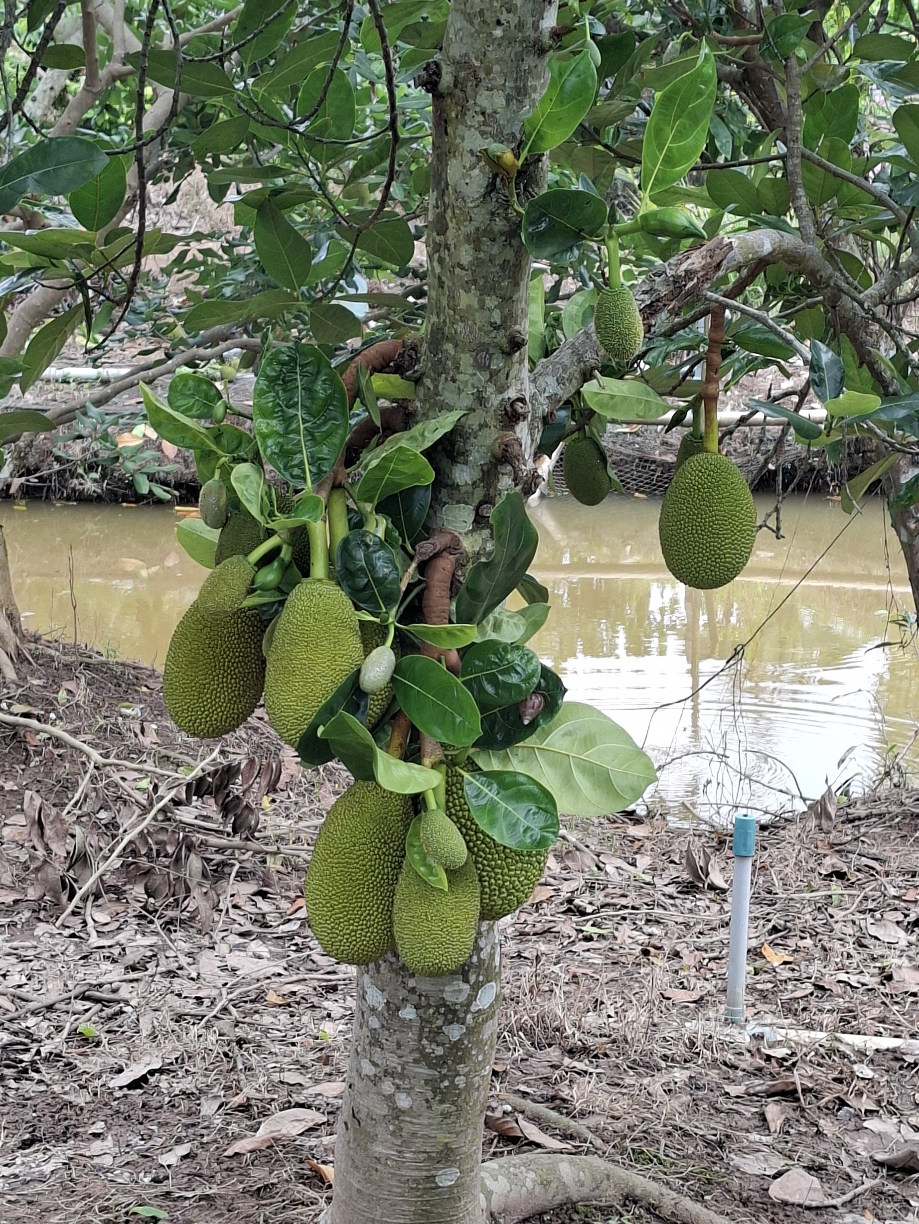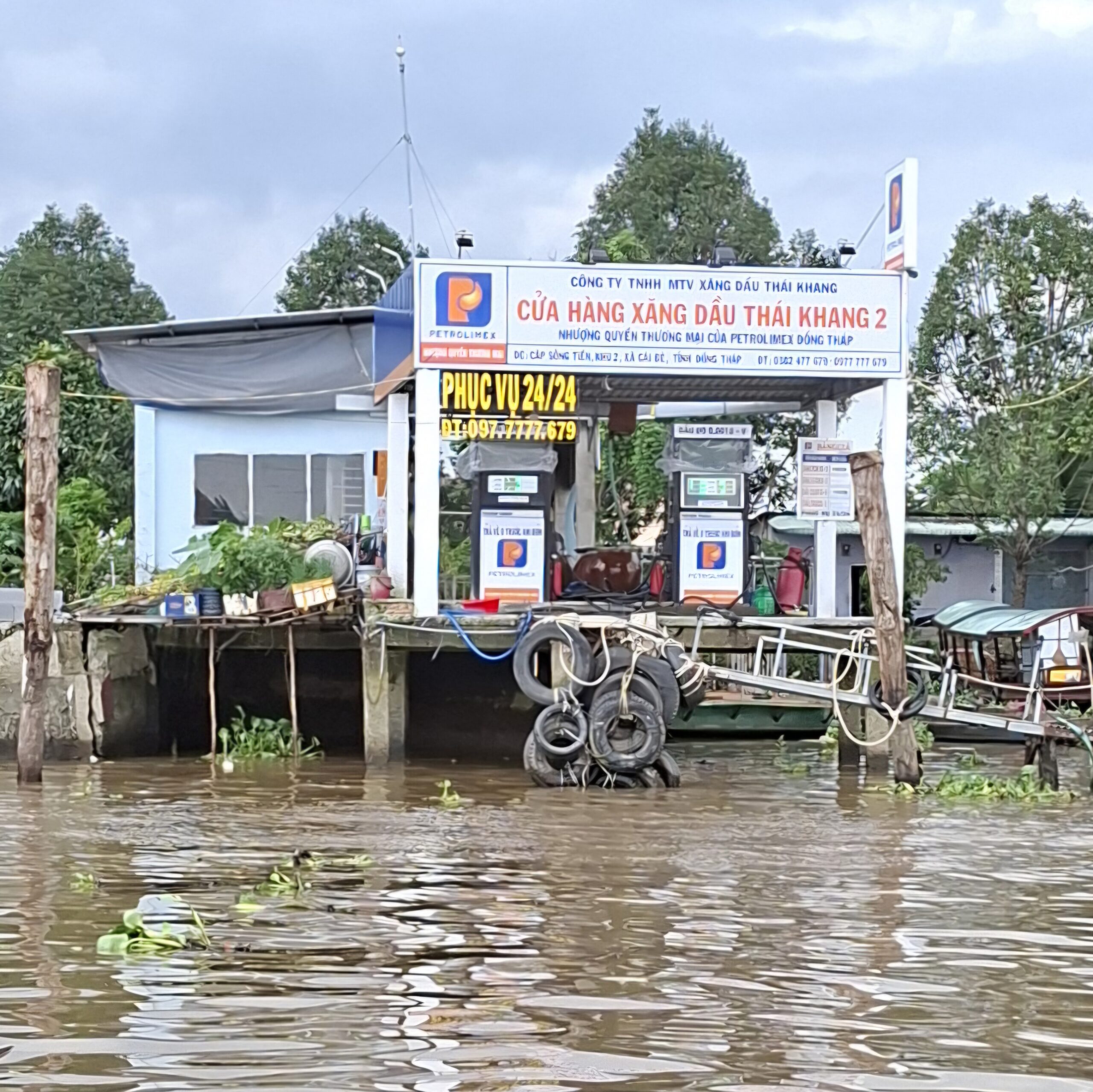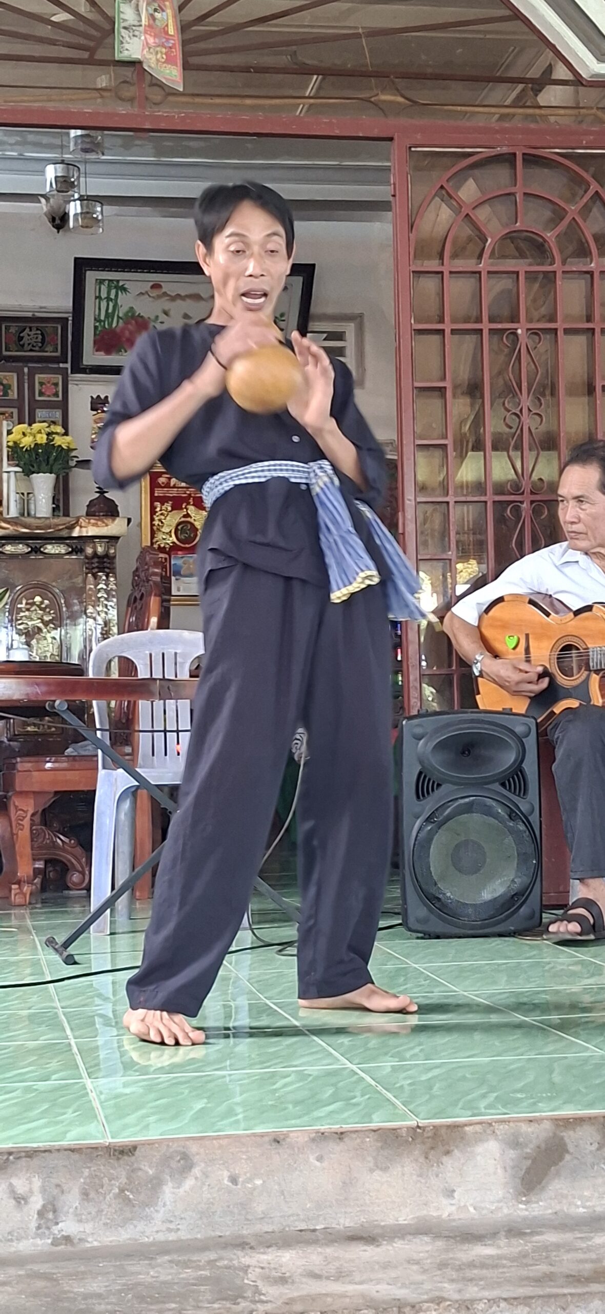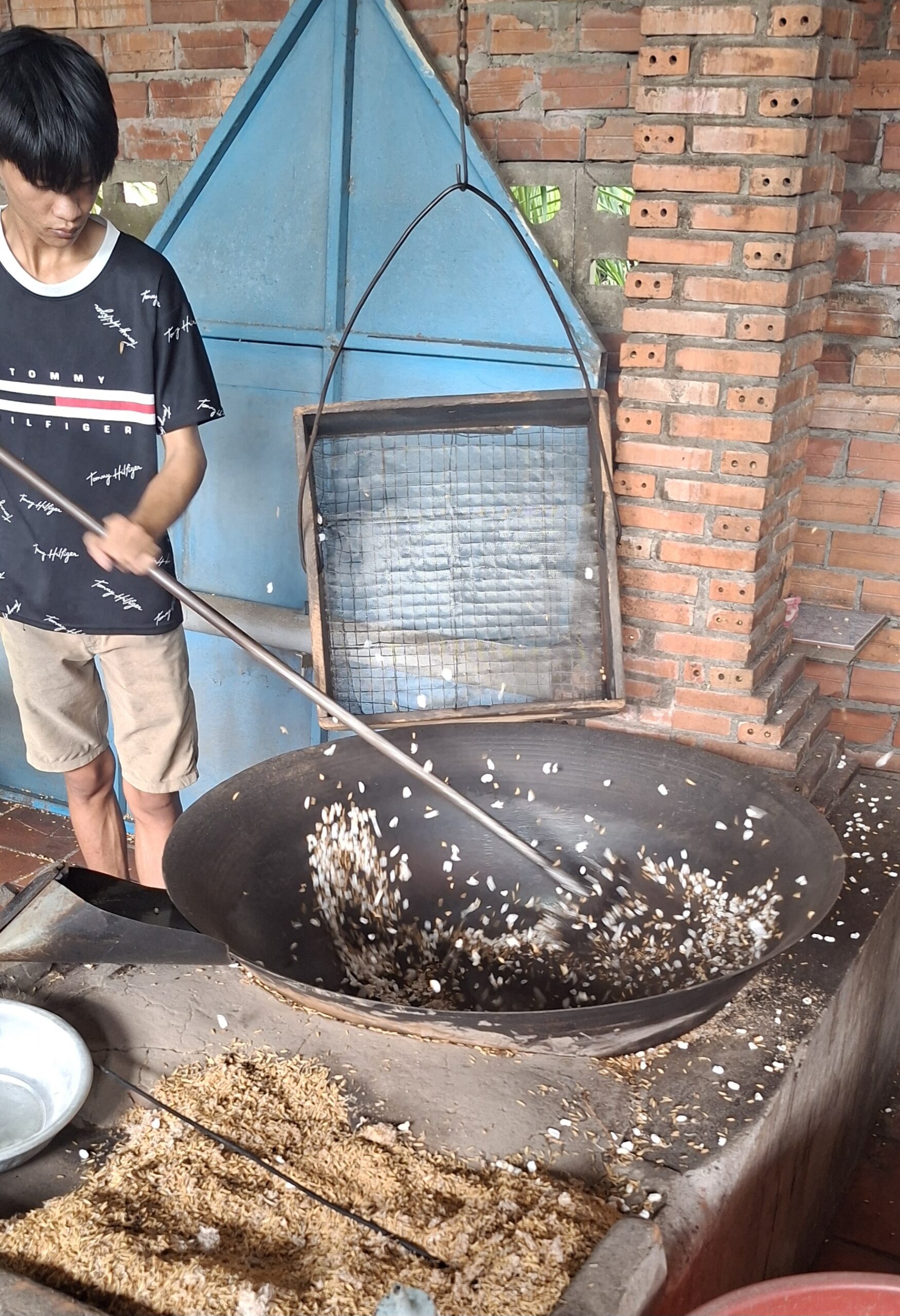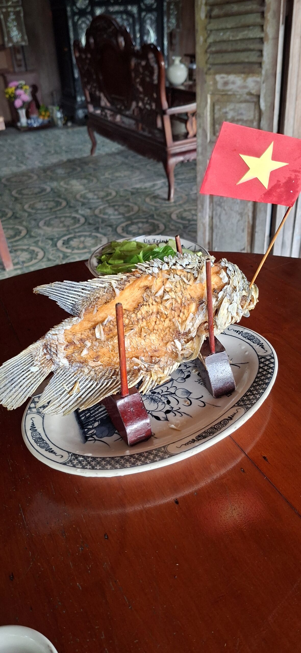 Quitter HCMV prend un certain temps. Il nous faut 2h30 pour atteindre notre première étape. Nous montons dans un bateau, rien que pour nous. On visite un espace où différents produits locaux sont fabriqués: galettes de riz, riz soufflé, alcool de riz, caramels, etc. On fait quelques petits achats (qui seront noyés par un orage un peu plus tard dans la journée). On traverse un zone humide en pirogue. Marie goûte le contenu d’une noix de coco fraîche. On atteint ensuite la guesthouse familiale où nous prenons notre repas (7 services). Et c’est à la fin du repas qu’il commence à pleuvoir… un peu… beaucoup… à torrent! On est bloqué dans la guesthouse, et on attend que ça passe 🤗 Ça ne passe pas 😝