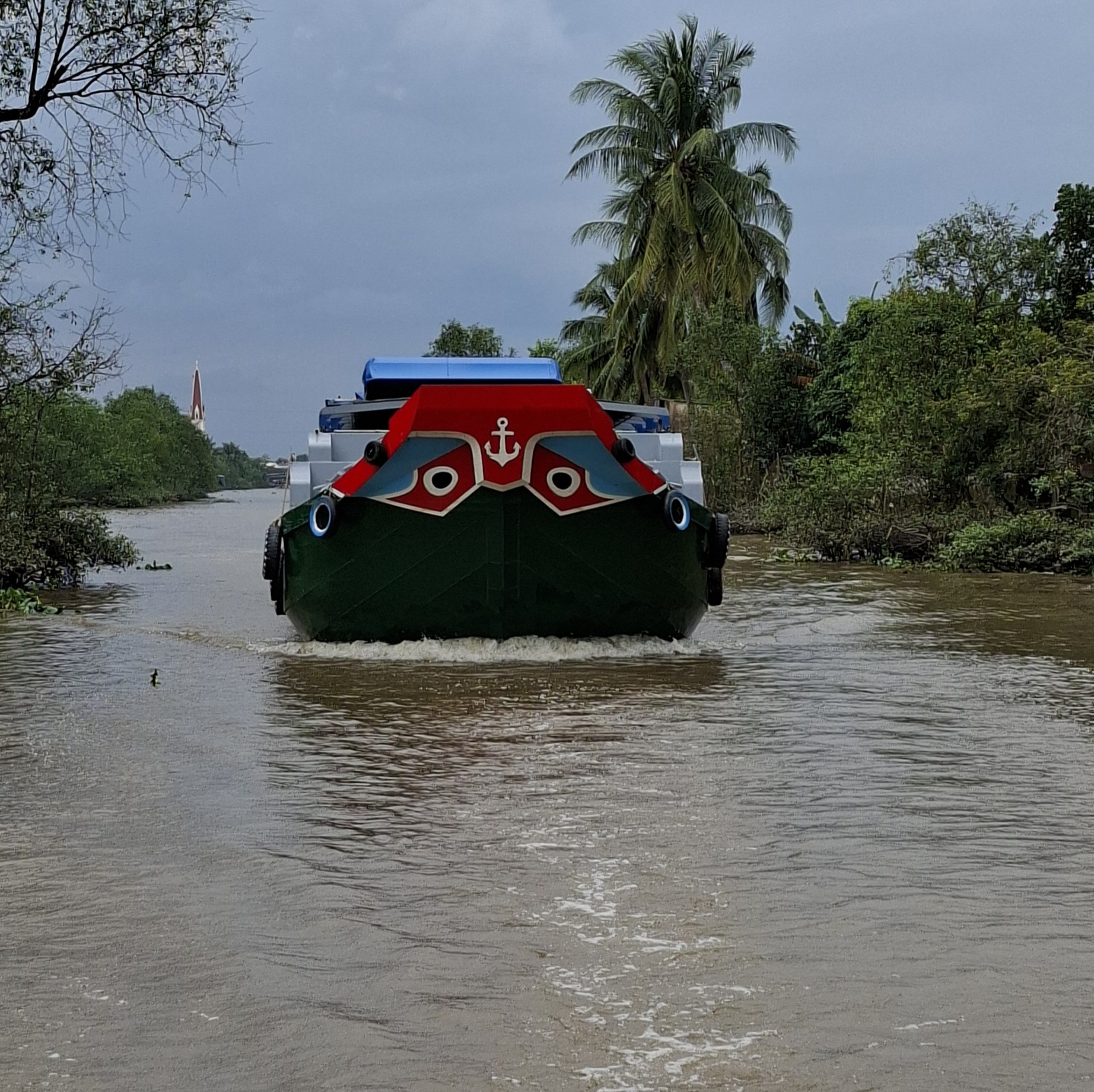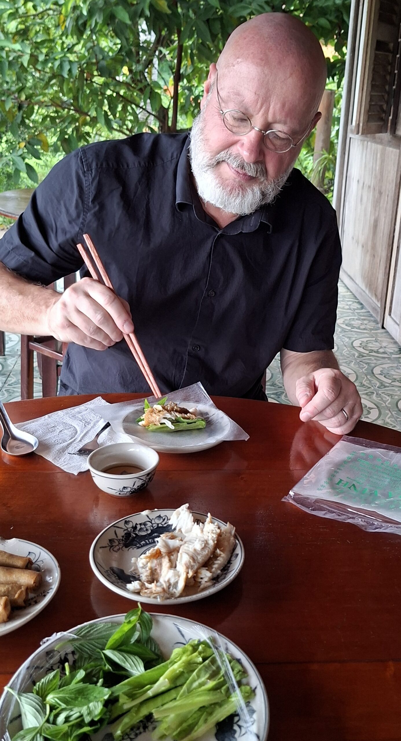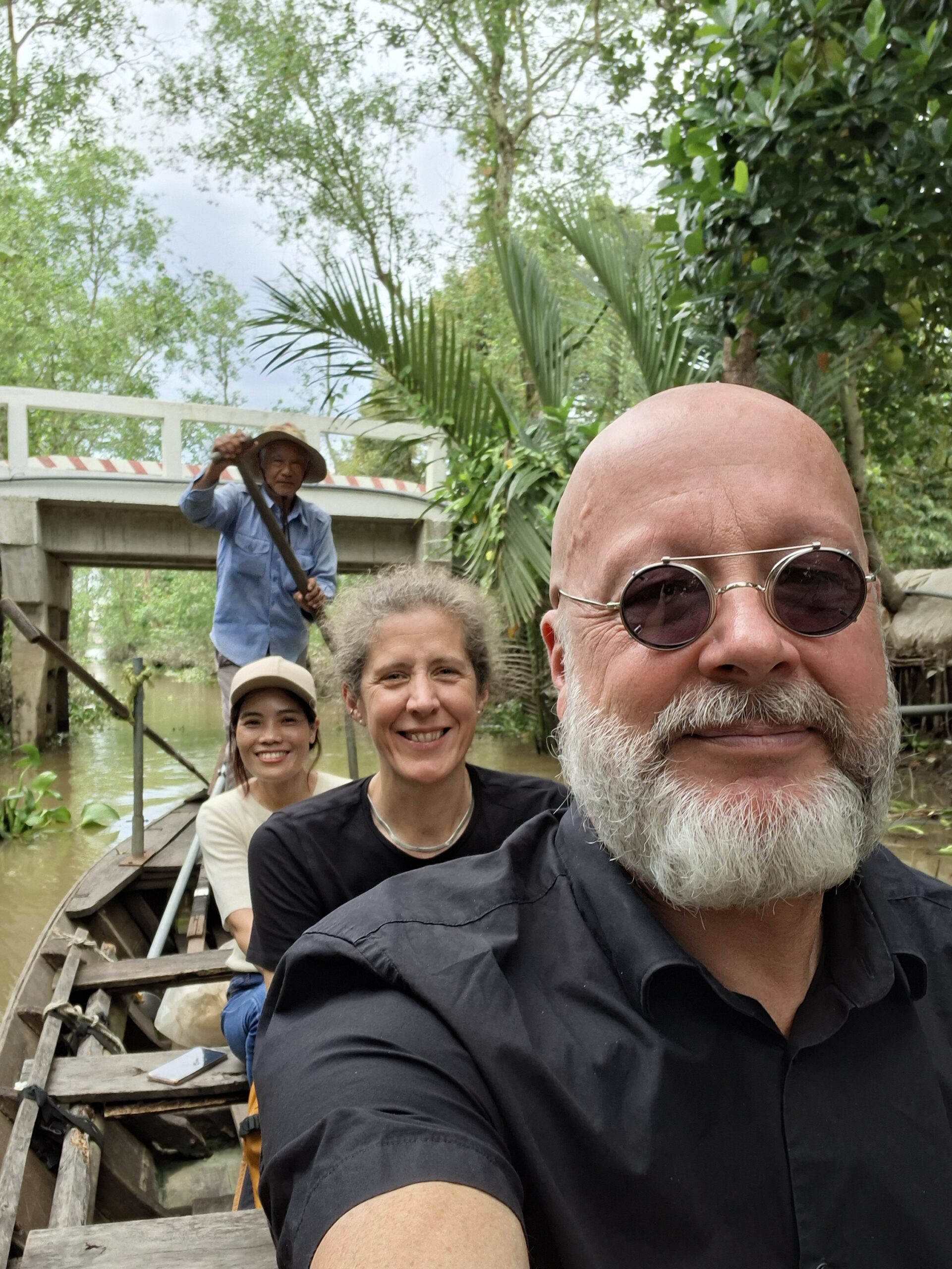 Benoît aime bien le bateau ( https://buchau.be/Vietnam2025/wp-content/uploads/2025/10/20251029_162806-scaled-1024×577.jpg ), mais aujourd’hui ce n’est pas lui qui a l’air le plus béat dans le delta 😁 (Ici tout va bien. Je vous ai bien vengé de l’insulte d’hier. J’ai eu une idée géniale: j’ai imprimé en A4 la photo du paquet de chà chiên prise dans un supermarket à HCMV, je l’ai collée sur votre porte et j’ai rajouté un post-it avec écrit « Fripouille on en fera du pâté »!)